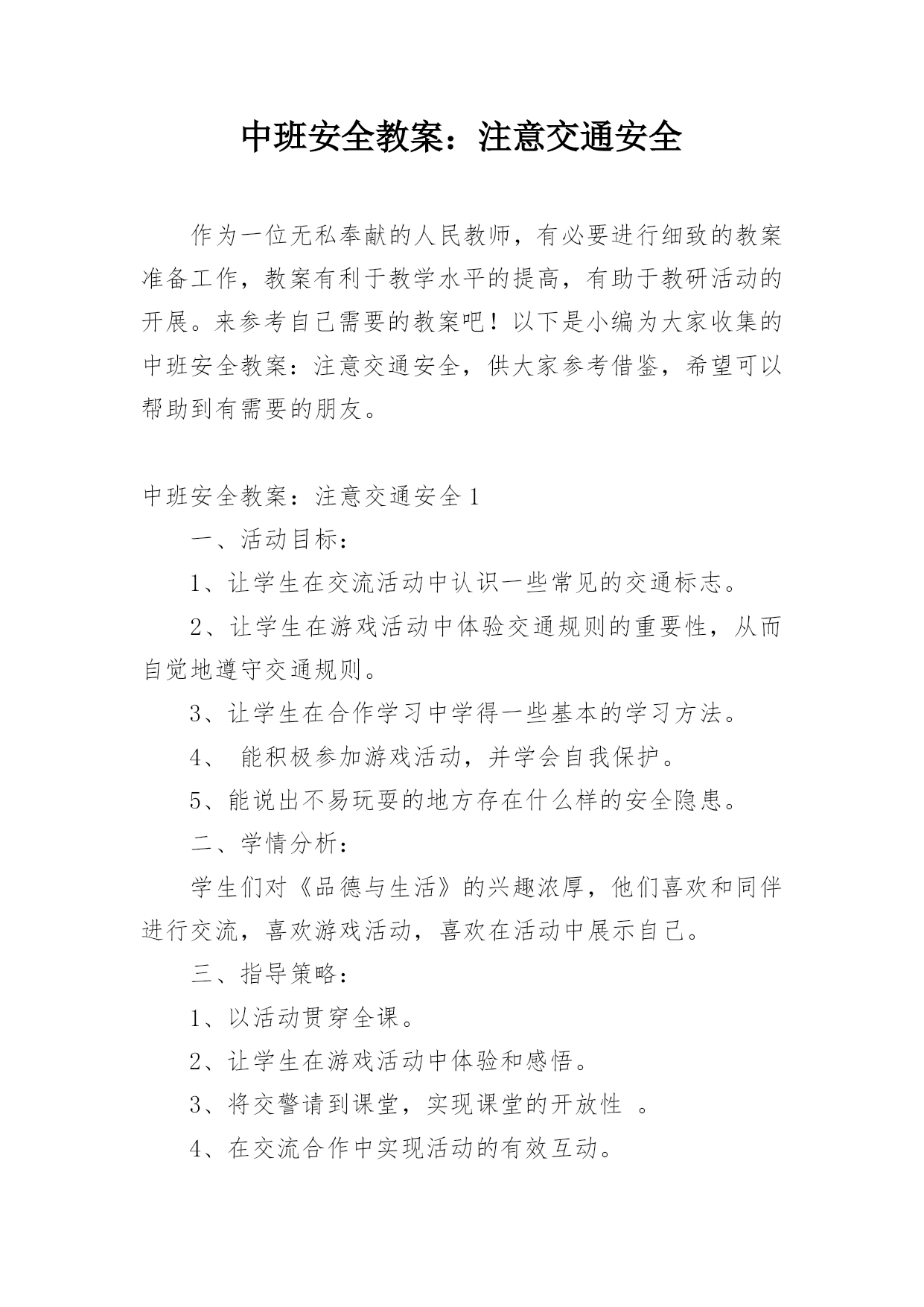 中班安全教案:注意交通安全作为一位无私奉献的人民教师,有必要进行细致的教案准备工作,教案有利于教学水平的提高,有助于教研活动的开展。来参考自己需要的教案吧!以下是小编为大家收集的中班安全教案:注意交通安全,供大家参考借鉴,希望可以帮助到有需要的朋友。中班安全教案:注意交通安全1一、活动目标:1、让学生在交流活动中认识一些常见的交通标志。2、让学生在游戏活动中体验交通规则的重要性,从而自觉地遵守交通规则。3、让学生在合作学习中学得一些基本的学习方法。4、能积极参加游戏活动,并学会自我保护。5、能说出不易玩耍