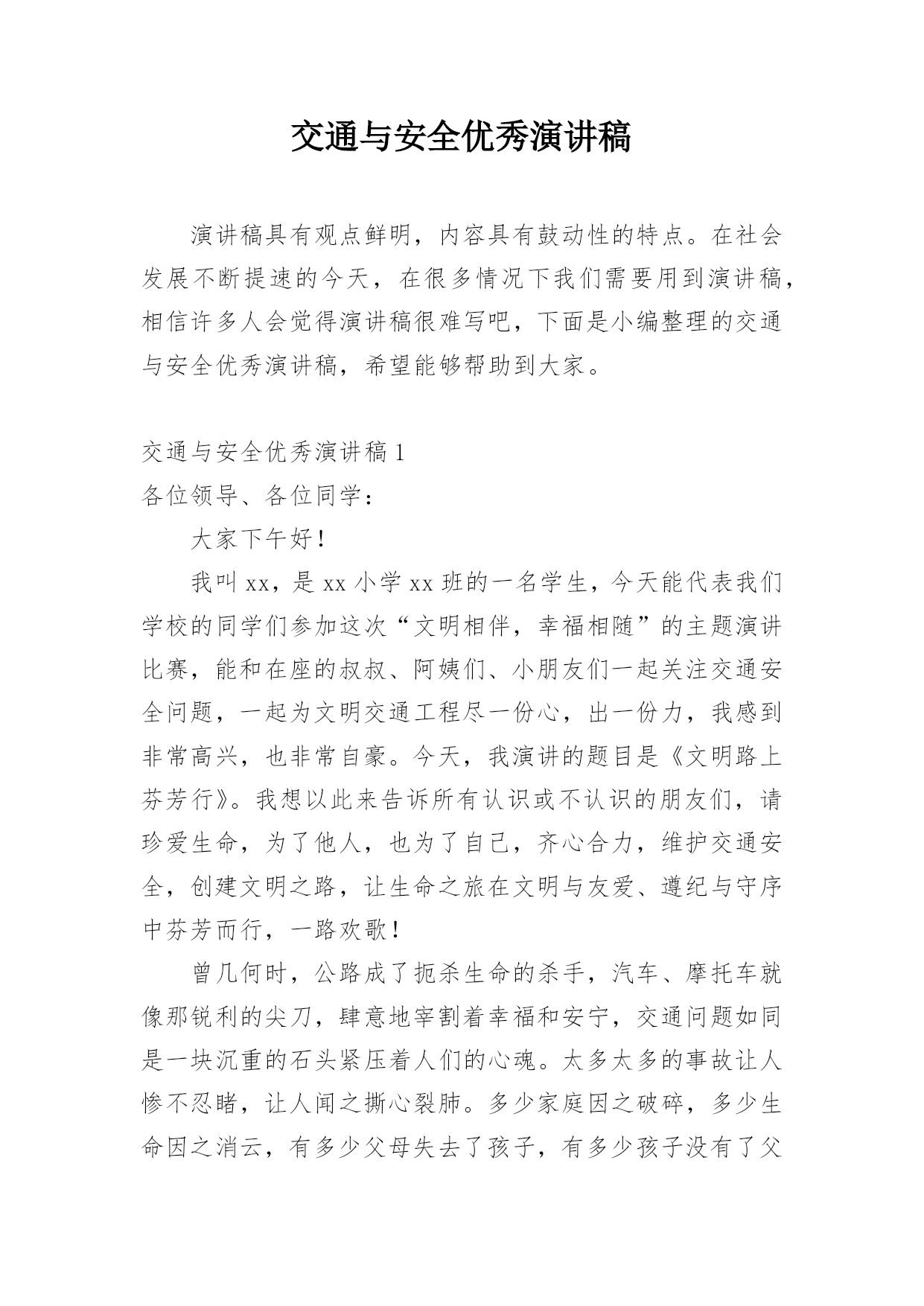交通与安全优秀演讲稿演讲稿具有观点鲜明,内容具有鼓动性的特点。在社会发展不断提速的今天,在很多情况下我们需要用到演讲稿,相信许多人会觉得演讲稿很难写吧,下面是小编整理的交通与安全优秀演讲稿,希望能够帮助到大家。交通与安全优秀演讲稿1各位领导、各位同学:大家下午好!我叫xx,是xx小学xx班的一名学生,今天能代表我们学校的同学们参加这次“文明相伴,幸福相随”的主题演讲比赛,能和在座的叔叔、阿姨们、小朋友们一起关注交通安全问题,一起为文明交通工程尽一份心,出一份力,我感到非常高兴,也非常自豪。今天,我演讲的题