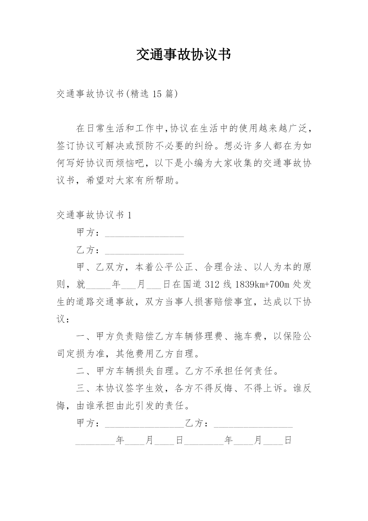 交通事故协议书交通事故协议书(精选15篇)在日常生活和工作中,协议在生活中的使用越来越广泛,签订协议可解决或预防不必要的纠纷。想必许多人都在为如何写好协议而烦恼吧,以下是小编为大家收集的交通事故协议书,希望对大家有所帮助。交通事故协议书1甲方:________________乙方:________________甲、乙双方,本着公平公正、合理合法、以人为本的原则,就_____年___月___日在国道312线1839km+700m处发生的道路交通事故,双方当事人损害赔偿事宜,达成以下协议:一、甲方负责赔偿乙