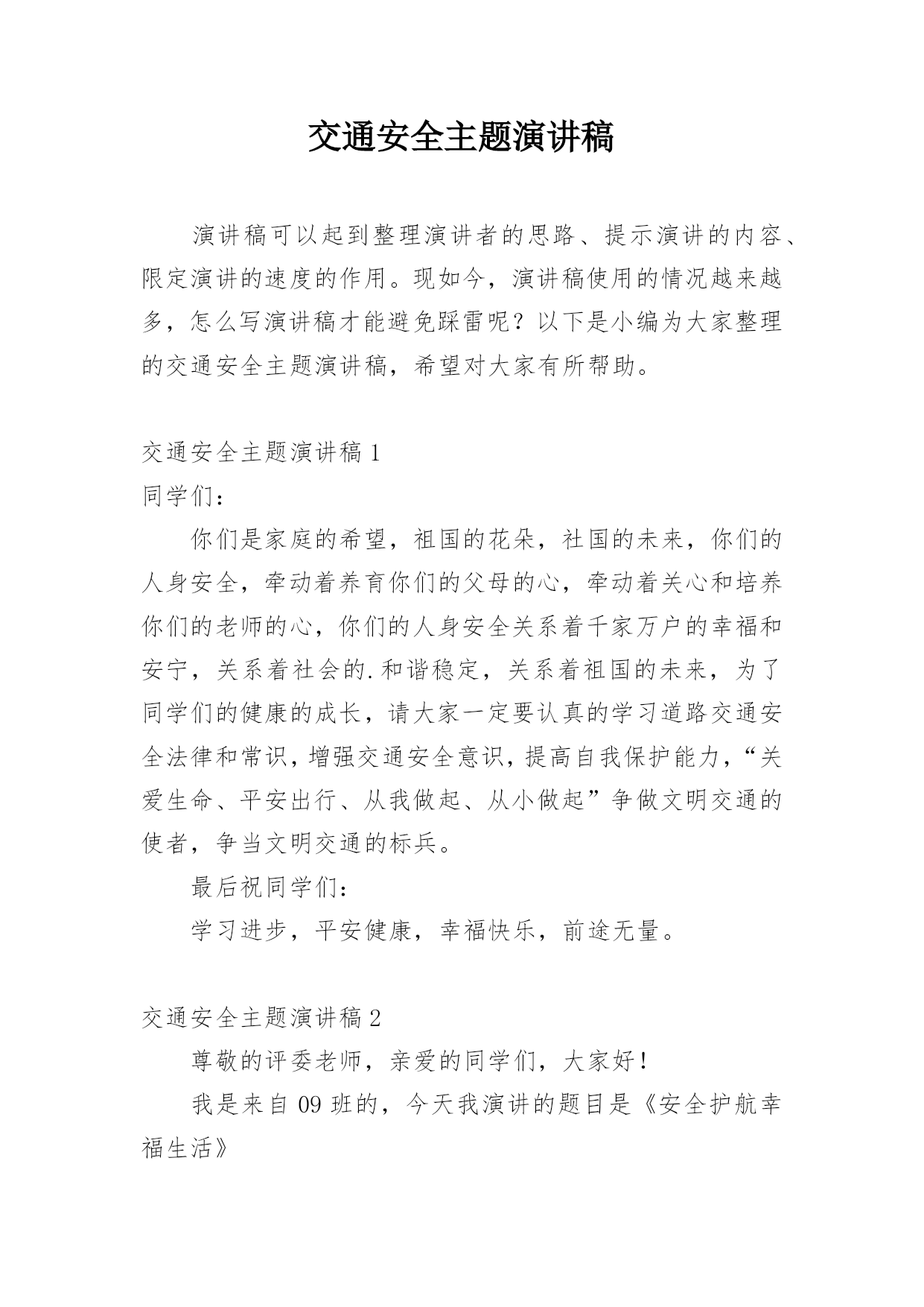 交通安全主题演讲稿演讲稿可以起到整理演讲者的思路、提示演讲的内容、限定演讲的速度的作用。现如今,演讲稿使用的情况越来越多,怎么写演讲稿才能避免踩雷呢?以下是小编为大家整理的交通安全主题演讲稿,希望对大家有所帮助。交通安全主题演讲稿1同学们:你们是家庭的希望,祖国的花朵,社国的未来,你们的人身安全,牵动着养育你们的父母的心,牵动着关心和培养你们的老师的心,你们的人身安全关系着千家万户的幸福和安宁,关系着社会的.和谐稳定,关系着祖国的未来,为了同学们的健康的成长,请大家一定要认真的学习道路交通安全法律和常识,