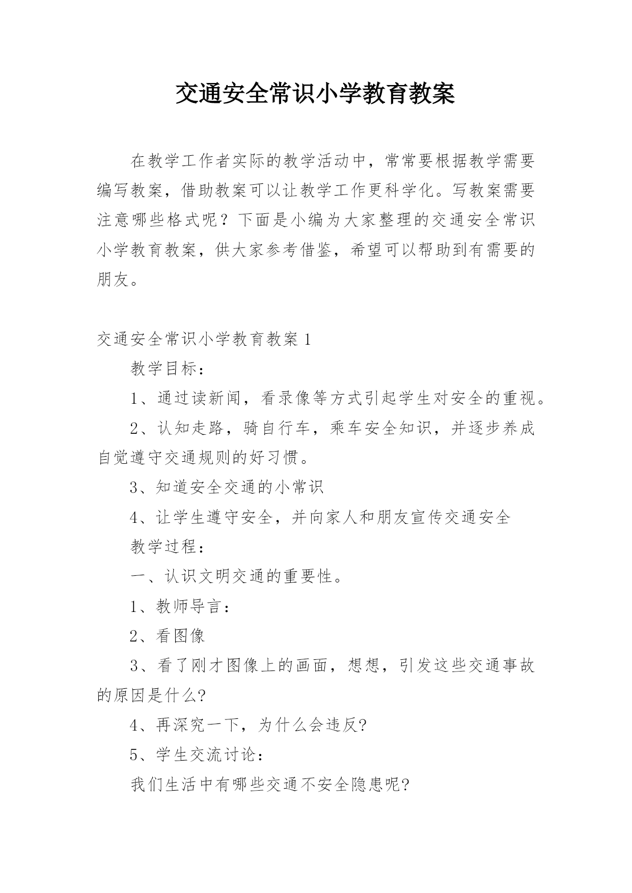 交通安全常识小学教育教案在教学工作者实际的教学活动中,常常要根据教学需要编写教案,借助教案可以让教学工作更科学化。写教案需要注意哪些格式呢?下面是小编为大家整理的交通安全常识小学教育教案,供大家参考借鉴,希望可以帮助到有需要的朋友。交通安全常识小学教育教案1教学目标:1、通过读新闻,看录像等方式引起学生对安全的重视。2、认知走路,骑自行车,乘车安全知识,并逐步养成自觉遵守交通规则的好习惯。3、知道安全交通的小常识4、让学生遵守安全,并向家人和朋友宣传交通安全教学过程:一、认识文明交通的重要性。1、教师导言