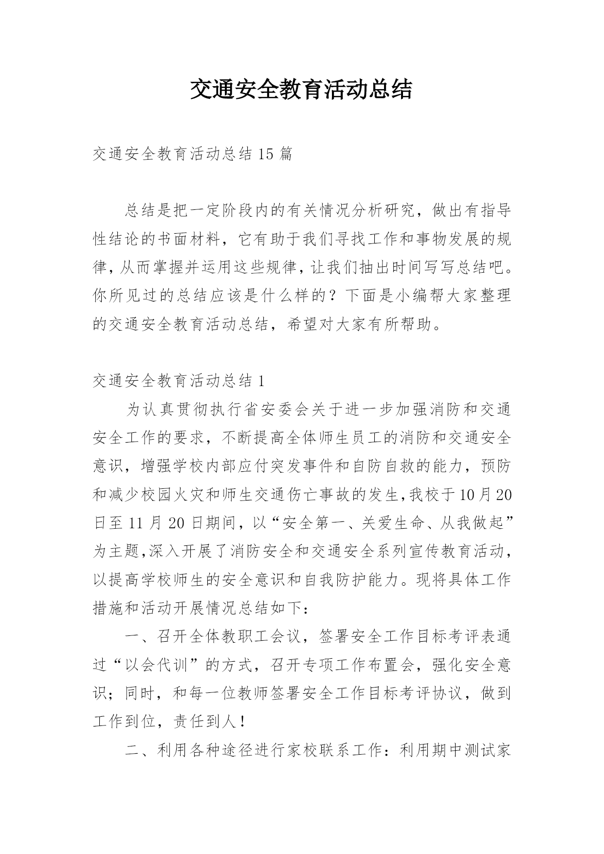 交通安全教育活动总结交通安全教育活动总结15篇总结是把一定阶段内的有关情况分析研究,做出有指导性结论的书面材料,它有助于我们寻找工作和事物发展的规律,从而掌握并运用这些规律,让我们抽出时间写写总结吧。你所见过的总结应该是什么样的?下面是小编帮大家整理的交通安全教育活动总结,希望对大家有所帮助。交通安全教育活动总结1为认真贯彻执行省安委会关于进一步加强消防和交通安全工作的要求,不断提高全体师生员工的消防和交通安全意识,增强学校内部应付突发事件和自防自救的能力,预防和减少校园火灾和师生交通伤亡事故的发生,我校