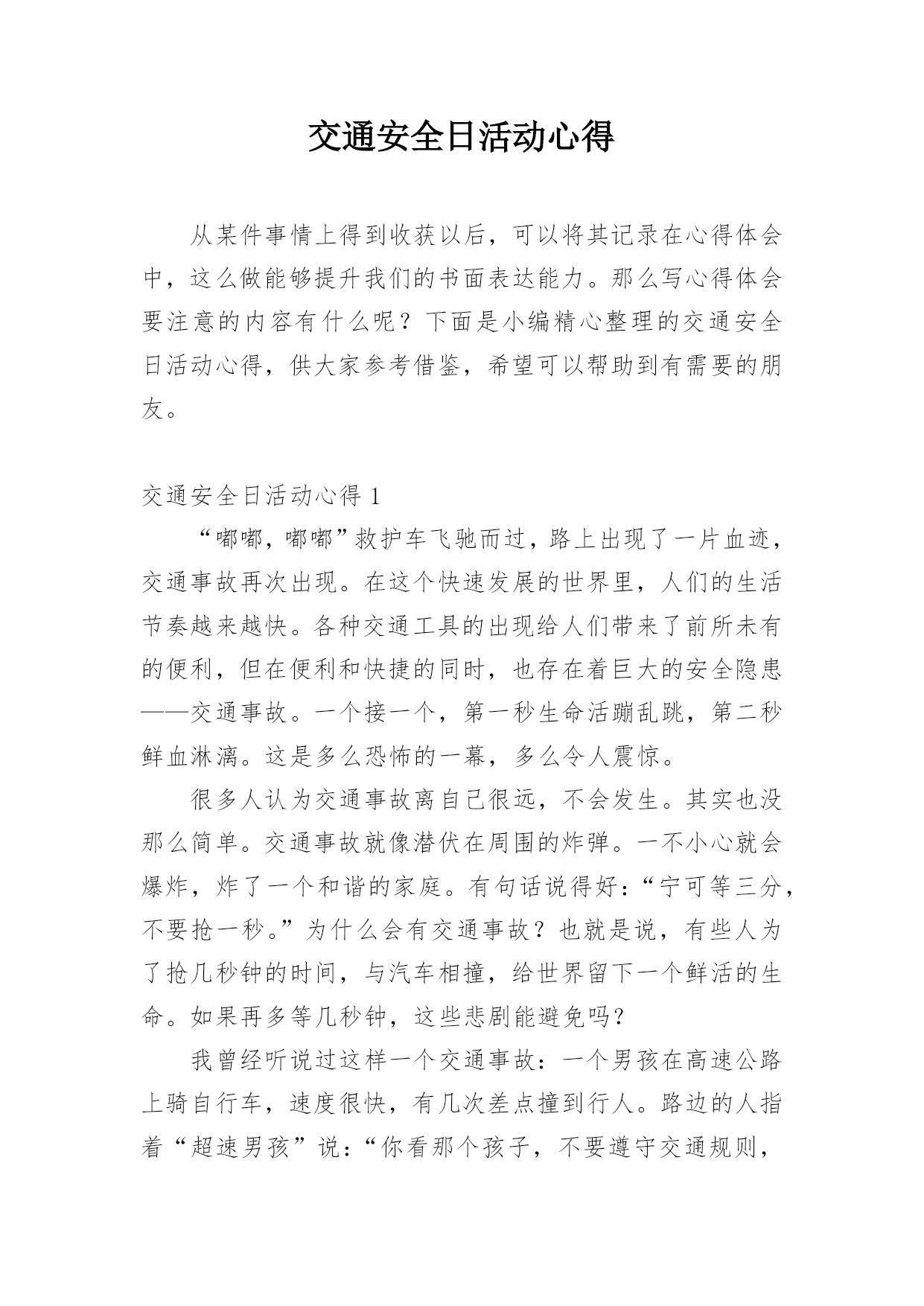 交通安全日活动心得从某件事情上得到收获以后,可以将其记录在心得体会中,这么做能够提升我们的书面表达能力。那么写心得体会要注意的内容有什么呢?下面是小编精心整理的交通安全日活动心得,供大家参考借鉴,希望可以帮助到有需要的朋友。交通安全日活动心得1“嘟嘟,嘟嘟”救护车飞驰而过,路上出现了一片血迹,交通事故再次出现。在这个快速发展的世界里,人们的生活节奏越来越快。各种交通工具的出现给人们带来了前所未有的便利,但在便利和快捷的同时,也存在着巨大的安全隐患——交通事故。一个接一个,第一秒生命活蹦乱跳,第二秒鲜血淋漓