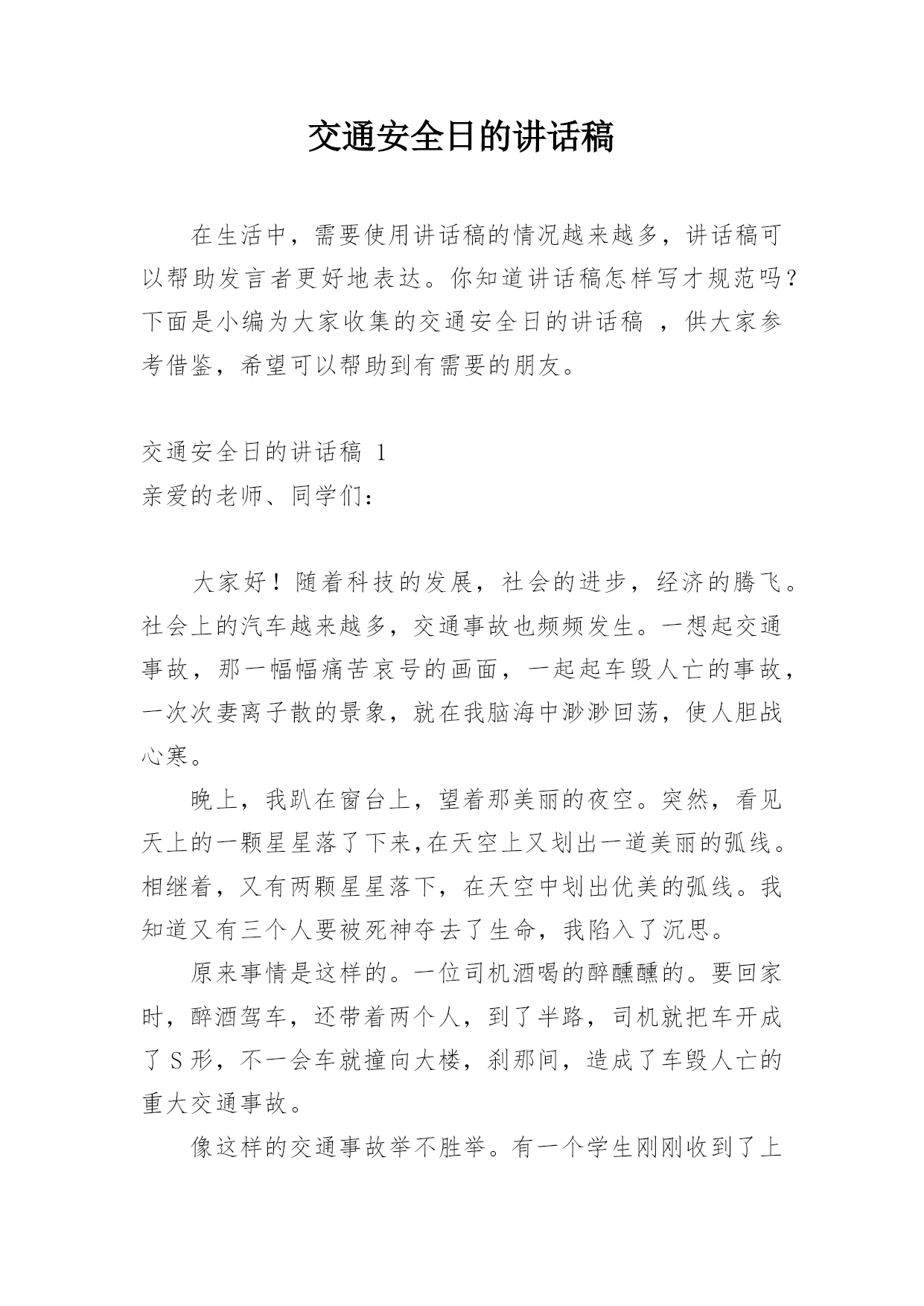 交通安全日的讲话稿在生活中,需要使用讲话稿的情况越来越多,讲话稿可以帮助发言者更好地表达。你知道讲话稿怎样写才规范吗?下面是小编为大家收集的交通安全日的讲话稿,供大家参考借鉴,希望可以帮助到有需要的朋友。交通安全日的讲话稿1亲爱的老师、同学们:大家好!随着科技的发展,社会的进步,经济的腾飞。社会上的汽车越来越多,交通事故也频频发生。一想起交通事故,那一幅幅痛苦哀号的画面,一起起车毁人亡的事故,一次次妻离子散的景象,就在我脑海中渺渺回荡,使人胆战心寒。晚上,我趴在窗台上,望着那美丽的夜空。突然,看见天上的一
