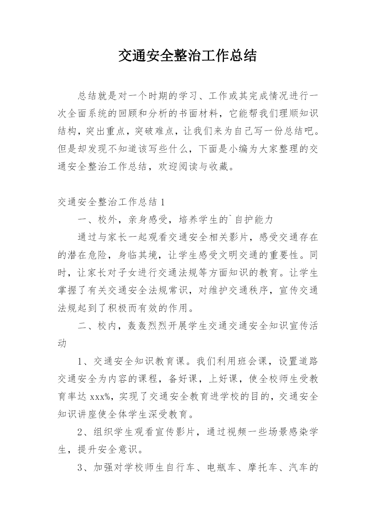交通安全整治工作总结总结就是对一个时期的学习、工作或其完成情况进行一次全面系统的回顾和分析的书面材料,它能帮我们理顺知识结构,突出重点,突破难点,让我们来为自己写一份总结吧。但是却发现不知道该写些什么,下面是小编为大家整理的交通安全整治工作总结,欢迎阅读与收藏。交通安全整治工作总结1一、校外,亲身感受,培养学生的`自护能力通过与家长一起观看交通安全相关影片,感受交通存在的潜在危险,身临其境,让学生感受文明交通的重要性。同时,让家长对子女进行交通法规等方面知识的教育。让学生掌握了有关交通安全法规常识,对维护