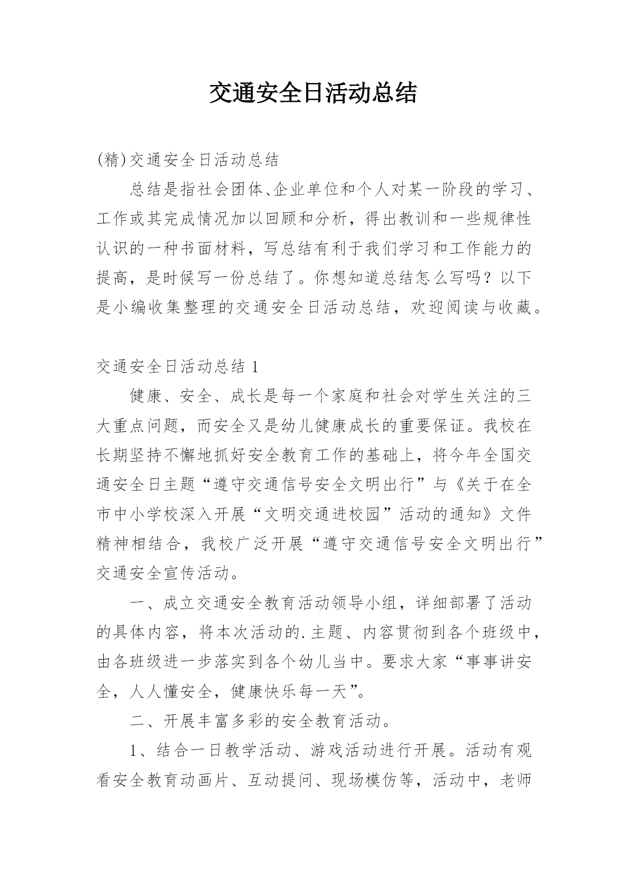 交通安全日活动总结(精)交通安全日活动总结总结是指社会团体、企业单位和个人对某一阶段的学习、工作或其完成情况加以回顾和分析,得出教训和一些规律性认识的一种书面材料,写总结有利于我们学习和工作能力的提高,是时候写一份总结了。你想知道总结怎么写吗?以下是小编收集整理的交通安全日活动总结,欢迎阅读与收藏。交通安全日活动总结1健康、安全、成长是每一个家庭和社会对学生关注的三大重点问题,而安全又是幼儿健康成长的重要保证。我校在长期坚持不懈地抓好安全教育工作的基础上,将今年全国交通安全日主题“遵守交通信号安全文明出行