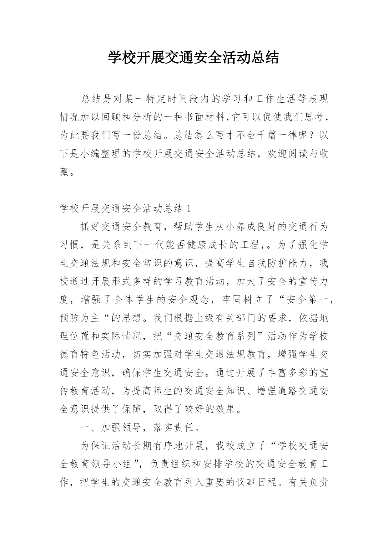 学校开展交通安全活动总结总结是对某一特定时间段内的学习和工作生活等表现情况加以回顾和分析的一种书面材料,它可以促使我们思考,为此要我们写一份总结。总结怎么写才不会千篇一律呢?以下是小编整理的学校开展交通安全活动总结,欢迎阅读与收藏。学校开展交通安全活动总结1抓好交通安全教育,帮助学生从小养成良好的交通行为习惯,是关系到下一代能否健康成长的工程,。为了强化学生交通法规和安全常识的意识,提高学生自我防护能力,我校通过开展形式多样的学习教育活动,加大了安全的宣传力度,增强了全体学生的安全观念,牢固树立了“安全第