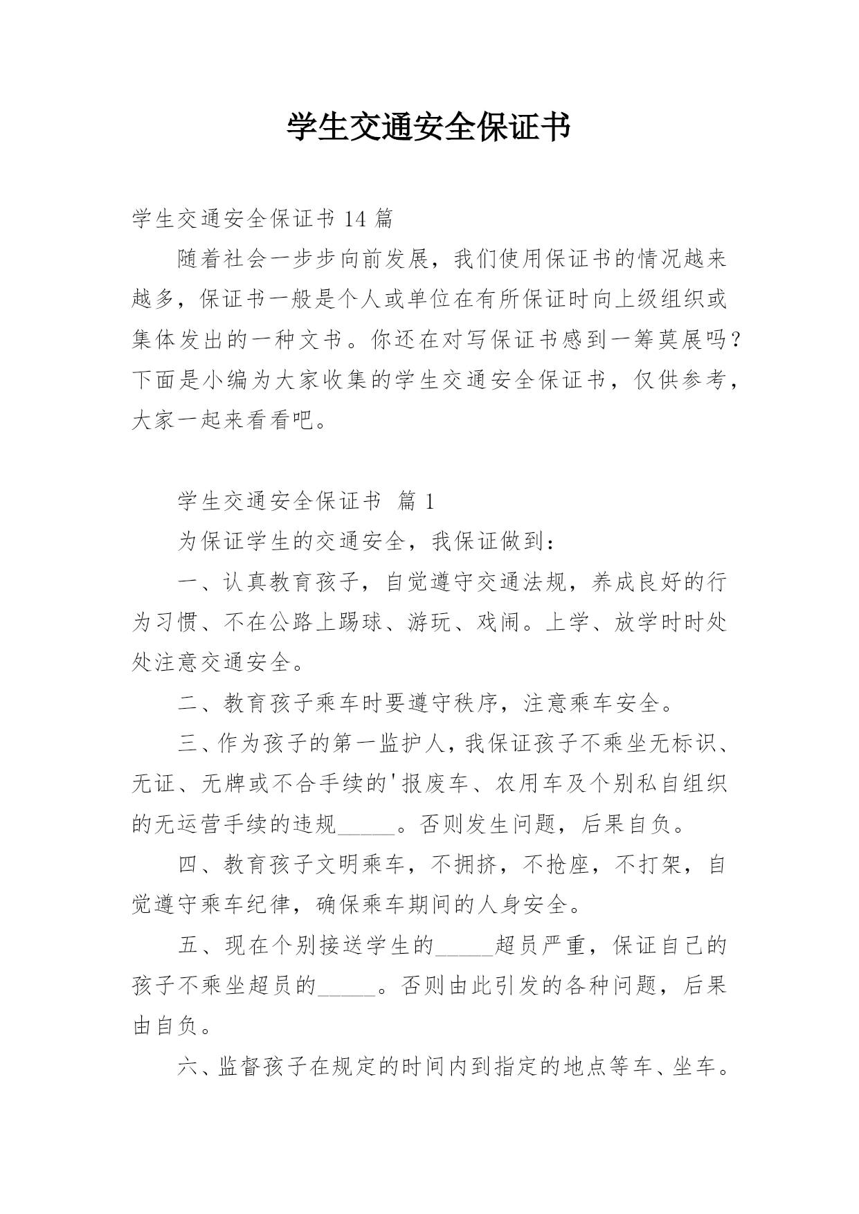 学生交通安全保证书学生交通安全保证书14篇随着社会一步步向前发展,我们使用保证书的情况越来越多,保证书一般是个人或单位在有所保证时向上级组织或集体发出的一种文书。你还在对写保证书感到一筹莫展吗?下面是小编为大家收集的学生交通安全保证书,仅供参考,大家一起来看看吧。学生交通安全保证书篇1为保证学生的交通安全,我保证做到:一、认真教育孩子,自觉遵守交通法规,养成良好的行为习惯、不在公路上踢球、游玩、戏闹。上学、放学时时处处注意交通安全。二、教育孩子乘车时要遵守秩序,注意乘车安全。三、作为孩子的第一监护人,我保