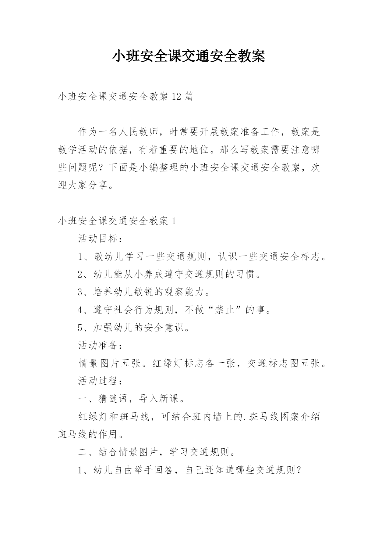 小班安全课交通安全教案小班安全课交通安全教案12篇作为一名人民教师,时常要开展教案准备工作,教案是教学活动的依据,有着重要的地位。那么写教案需要注意哪些问题呢?下面是小编整理的小班安全课交通安全教案,欢迎大家分享。小班安全课交通安全教案1活动目标:1、教幼儿学习一些交通规则,认识一些交通安全标志。2、幼儿能从小养成遵守交通规则的习惯。3、培养幼儿敏锐的观察能力。4、遵守社会行为规则,不做“禁止”的事。5、加强幼儿的安全意识。活动准备:情景图片五张。红绿灯标志各一张,交通标志图五张。活动过程:一、猜谜语,导