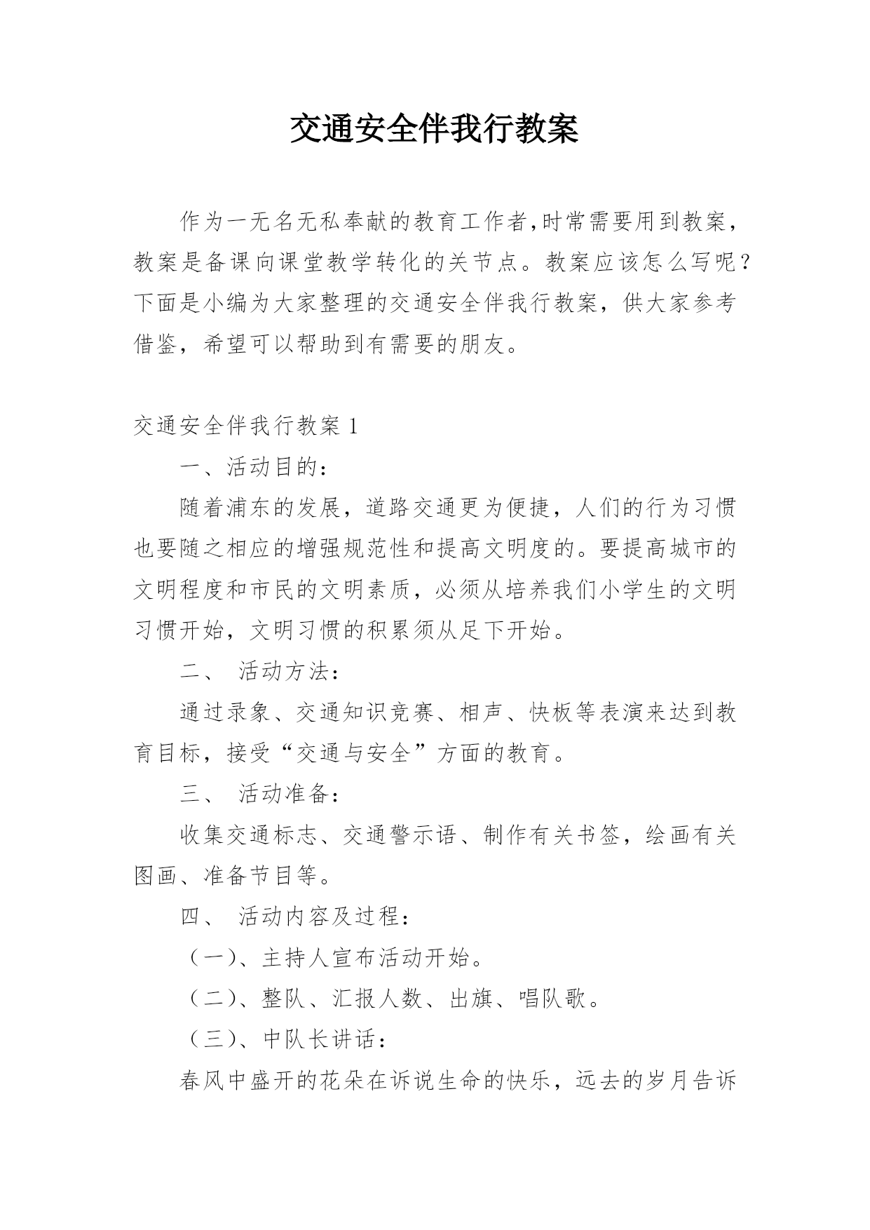 交通安全伴我行教案作为一无名无私奉献的教育工作者,时常需要用到教案,教案是备课向课堂教学转化的关节点。教案应该怎么写呢?下面是小编为大家整理的交通安全伴我行教案,供大家参考借鉴,希望可以帮助到有需要的朋友。交通安全伴我行教案1一、活动目的:随着浦东的发展,道路交通更为便捷,人们的行为习惯也要随之相应的增强规范性和提高文明度的。要提高城市的文明程度和市民的文明素质,必须从培养我们小学生的文明习惯开始,文明习惯的积累须从足下开始。二、活动方法:通过录象、交通知识竞赛、相声、快板等表演来达到教育目标,接受“交通