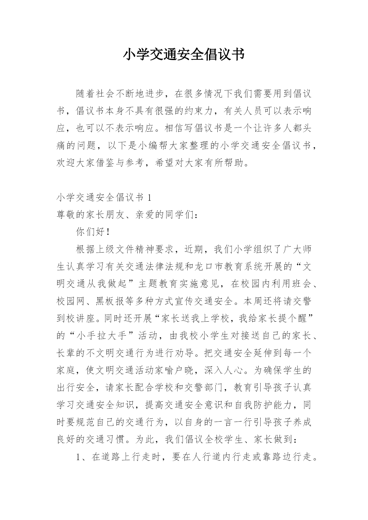 小学交通安全倡议书随着社会不断地进步,在很多情况下我们需要用到倡议书,倡议书本身不具有很强的约束力,有关人员可以表示响应,也可以不表示响应。相信写倡议书是一个让许多人都头痛的问题,以下是小编帮大家整理的小学交通安全倡议书,欢迎大家借鉴与参考,希望对大家有所帮助。小学交通安全倡议书1尊敬的家长朋友、亲爱的同学们:你们好!根据上级文件精神要求,近期,我们小学组织了广大师生认真学习有关交通法律法规和龙口市教育系统开展的“文明交通从我做起”主题教育实施意见,在校园内利用班会、校园网、黑板报等多种方式宣传交通安全。