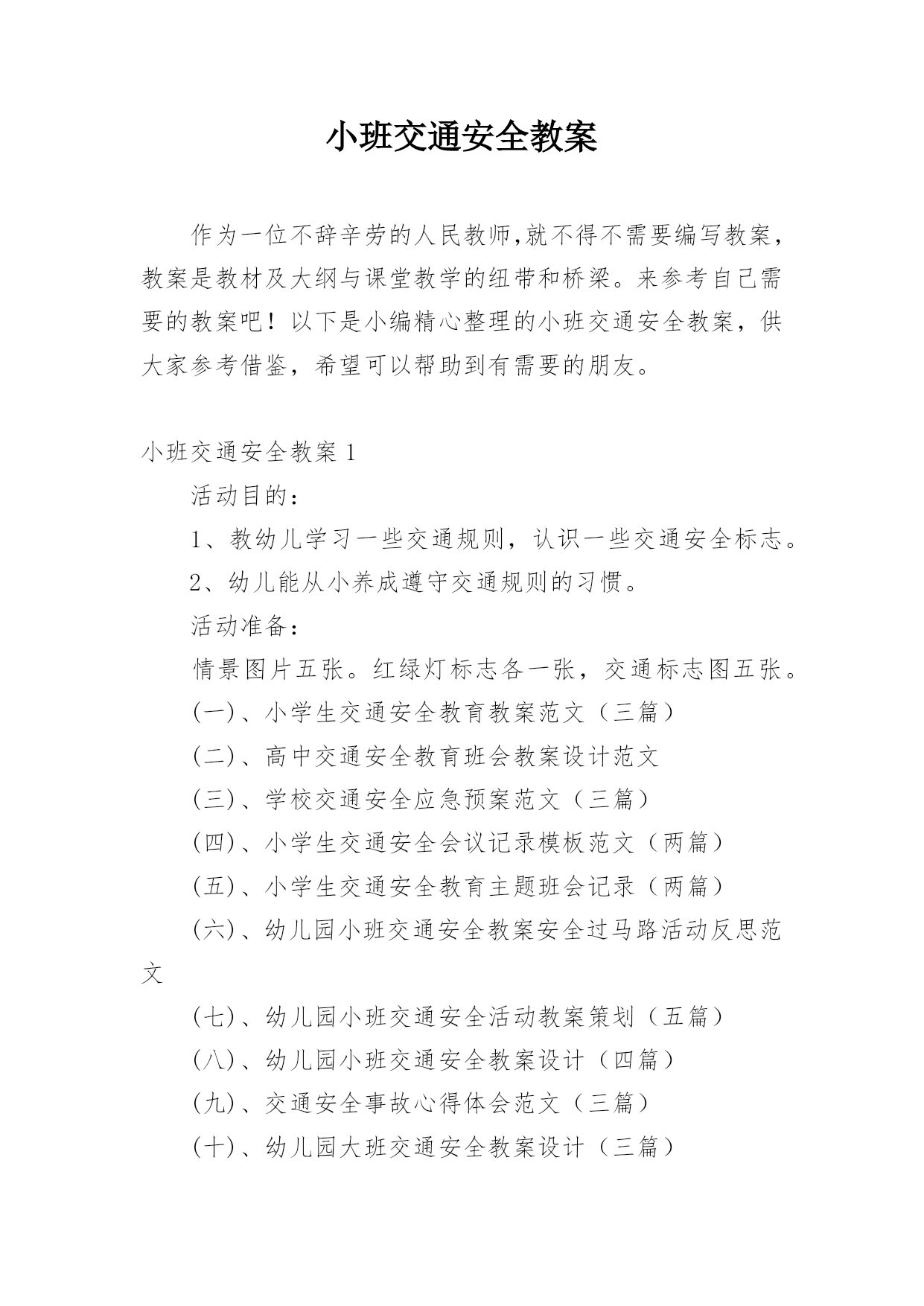 小班交通安全教案作为一位不辞辛劳的人民教师,就不得不需要编写教案,教案是教材及大纲与课堂教学的纽带和桥梁。来参考自己需要的教案吧!以下是小编精心整理的小班交通安全教案,供大家参考借鉴,希望可以帮助到有需要的朋友。小班交通安全教案1活动目的:1、教幼儿学习一些交通规则,认识一些交通安全标志。2、幼儿能从小养成遵守交通规则的习惯。活动准备:情景图片五张。红绿灯标志各一张,交通标志图五张。(一)、小学生交通安全教育教案范文(三篇)(二)、高中交通安全教育班会教案设计范文(三)、学校交通安全应急预案范文(三篇)(