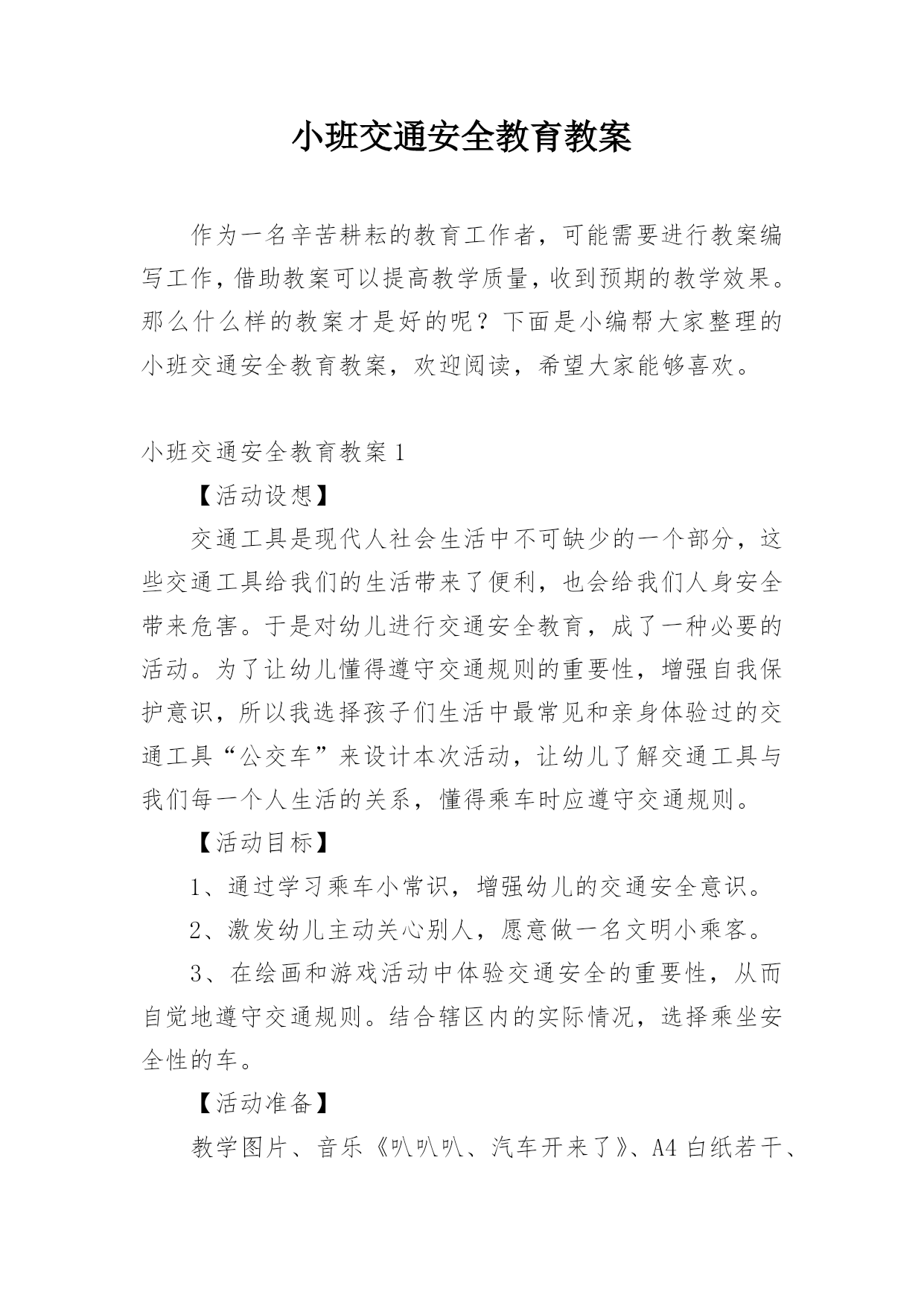 小班交通安全教育教案作为一名辛苦耕耘的教育工作者,可能需要进行教案编写工作,借助教案可以提高教学质量,收到预期的教学效果。那么什么样的教案才是好的呢?下面是小编帮大家整理的小班交通安全教育教案,欢迎阅读,希望大家能够喜欢。小班交通安全教育教案1【活动设想】交通工具是现代人社会生活中不可缺少的一个部分,这些交通工具给我们的生活带来了便利,也会给我们人身安全带来危害。于是对幼儿进行交通安全教育,成了一种必要的活动。为了让幼儿懂得遵守交通规则的重要性,增强自我保护意识,所以我选择孩子们生活中最常见和亲身体验过的