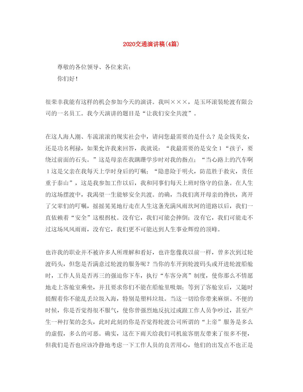 此资料由网络收集而来,如有侵权请告知上传者立即删除。资料共分享,我们负责传递知识。2020交通演讲稿(4篇)尊敬的各位领导、各位来宾:你们好!很荣幸我能有这样的机会参加今天的演讲。我叫×××,是玉环滚装轮渡有限公司的一名员工。我今天演讲的题目是“让我们安全共渡”。在这人海人潮、车流滚滚的现实社会中,请问您最需要的是什么?是金钱美女,还是功名利禄,如果允许我来回答,我就说:“我最需要的是安全1“孩子,要绕过前面的石头。”这是母亲在我蹒跚学步时对我的指点;“当心路上的汽车啊1这是父亲在我每天上学时身后的叮嘱;