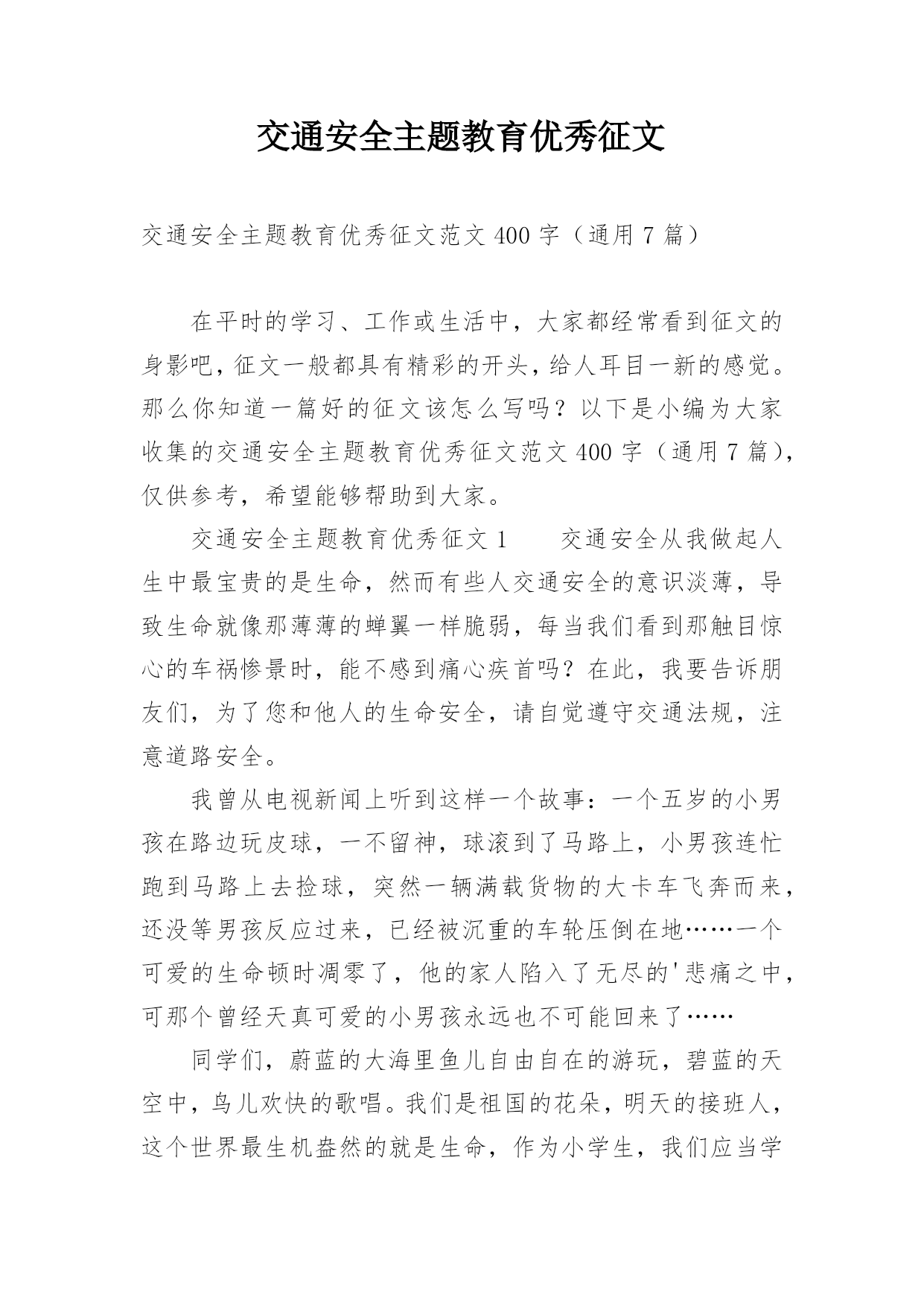 交通安全主题教育优秀征文交通安全主题教育优秀征文范文400字(通用7篇)在平时的学习、工作或生活中,大家都经常看到征文的身影吧,征文一般都具有精彩的开头,给人耳目一新的感觉。那么你知道一篇好的征文该怎么写吗?以下是小编为大家收集的交通安全主题教育优秀征文范文400字(通用7篇),仅供参考,希望能够帮助到大家。交通安全主题教育优秀征文1交通安全从我做起人生中最宝贵的是生命,然而有些人交通安全的意识淡薄,导致生命就像那薄薄的蝉翼一样脆弱,每当我们看到那触目惊心的车祸惨景时,能不感到痛心疾首吗?在此,我要告诉朋