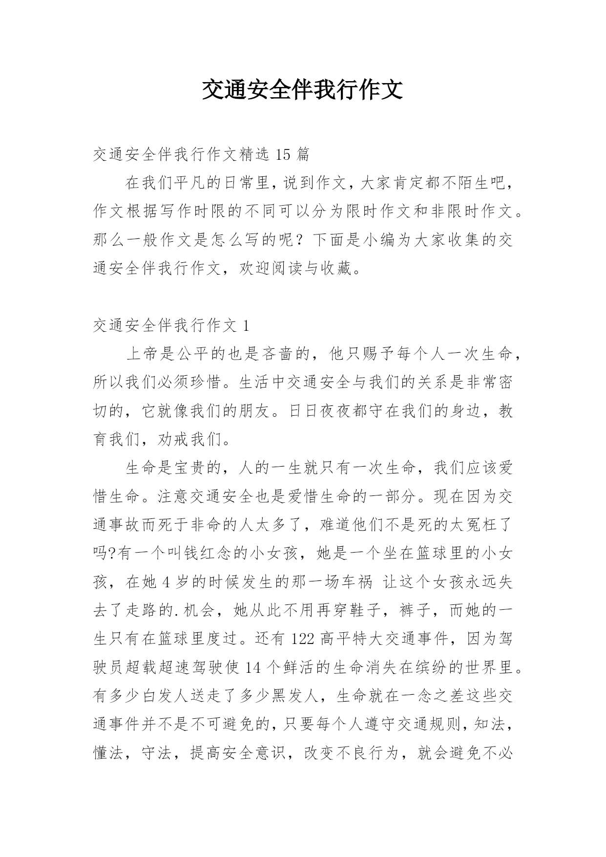 交通安全伴我行作文交通安全伴我行作文精选15篇在我们平凡的日常里,说到作文,大家肯定都不陌生吧,作文根据写作时限的不同可以分为限时作文和非限时作文。那么一般作文是怎么写的呢?下面是小编为大家收集的交通安全伴我行作文,欢迎阅读与收藏。交通安全伴我行作文1上帝是公平的也是吝啬的,他只赐予每个人一次生命,所以我们必须珍惜。生活中交通安全与我们的关系是非常密切的,它就像我们的朋友。日日夜夜都守在我们的身边,教育我们,劝戒我们。生命是宝贵的,人的一生就只有一次生命,我们应该爱惜生命。注意交通安全也是爱惜生命的一部分