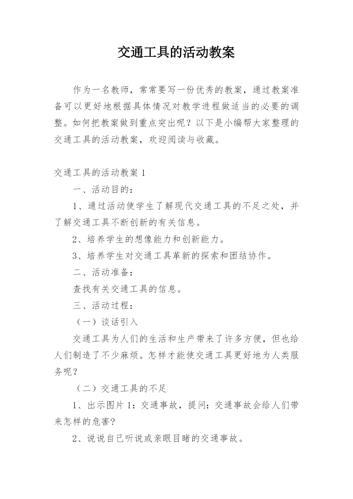 交通工具的活动教案作为一名教师,常常要写一份优秀的教案,通过教案准备可以更好地根据具体情况对教学进程做适当的必要的调整。如何把教案做到重点突出呢?以下是小编帮大家整理的交通工具的活动教案,欢迎阅读与收藏。交通工具的活动教案1一、活动目的:1、通过活动使学生了解现代交通工具的不足之处,并了解交通工具不断创新的有关信息。2、培养学生的想像能力和创新能力。3、培养学生对交通工具革新的探索和团结协作。二、活动准备:查找有关交通工具的信息。三、活动过程:(一)谈话引入交通工具为人们的生活和生产带来了许多方便,但也给