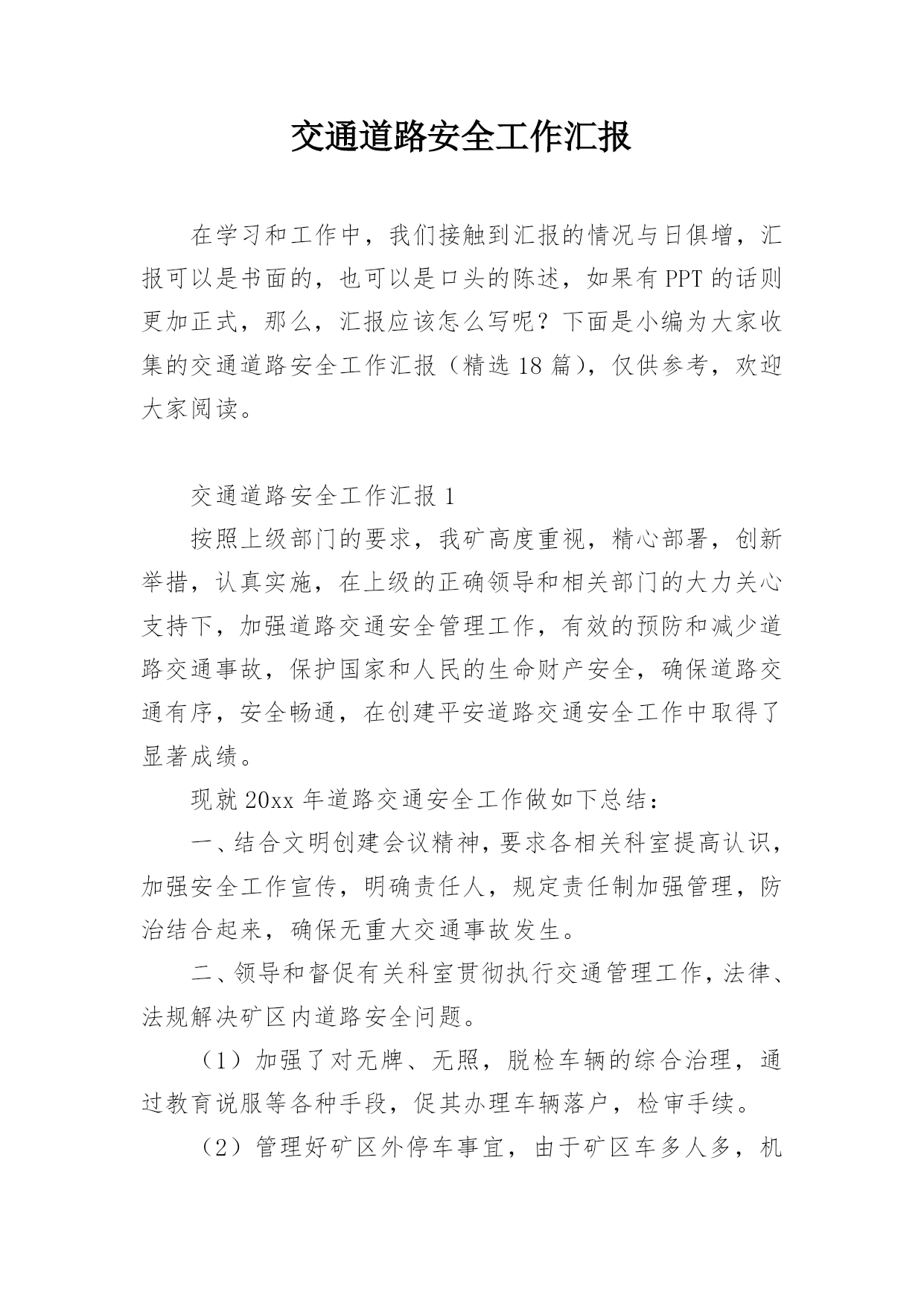 交通道路安全工作汇报在学习和工作中,我们接触到汇报的情况与日俱增,汇报可以是书面的,也可以是口头的陈述,如果有PPT的话则更加正式,那么,汇报应该怎么写呢?下面是小编为大家收集的交通道路安全工作汇报(精选18篇),仅供参考,欢迎大家阅读。交通道路安全工作汇报1按照上级部门的要求,我矿高度重视,精心部署,创新举措,认真实施,在上级的正确领导和相关部门的大力关心支持下,加强道路交通安全管理工作,有效的预防和减少道路交通事故,保护国家和人民的生命财产安全,确保道路交通有序,安全畅通,在创建平安道路交通安全工作中