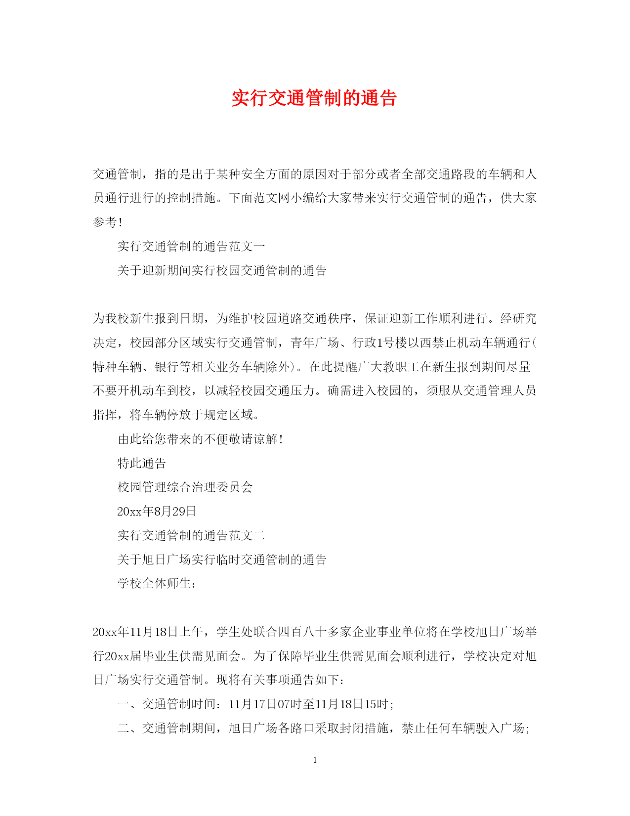 此资料由网络收集而来,如有侵权请告知上传者立即删除。资料共分享,我们负责传递知识。PAGEPAGE3实行交通管制的通告交通管制,指的是出于某种安全方面的原因对于部分或者全部交通路段的车辆和人员通行进行的控制措施。下面范文网小编给大家带来实行交通管制的通告,供大家参考!实行交通管制的通告范文一关于迎新期间实行校园交通管制的通告为我校新生报到日期,为维护校园道路交通秩序,保证迎新工作顺利进行。经研究决定,校园部分区域实行交通管制,青年广场、行政1号楼以西禁止机动车辆通行(特种车辆、银行等相关业务车