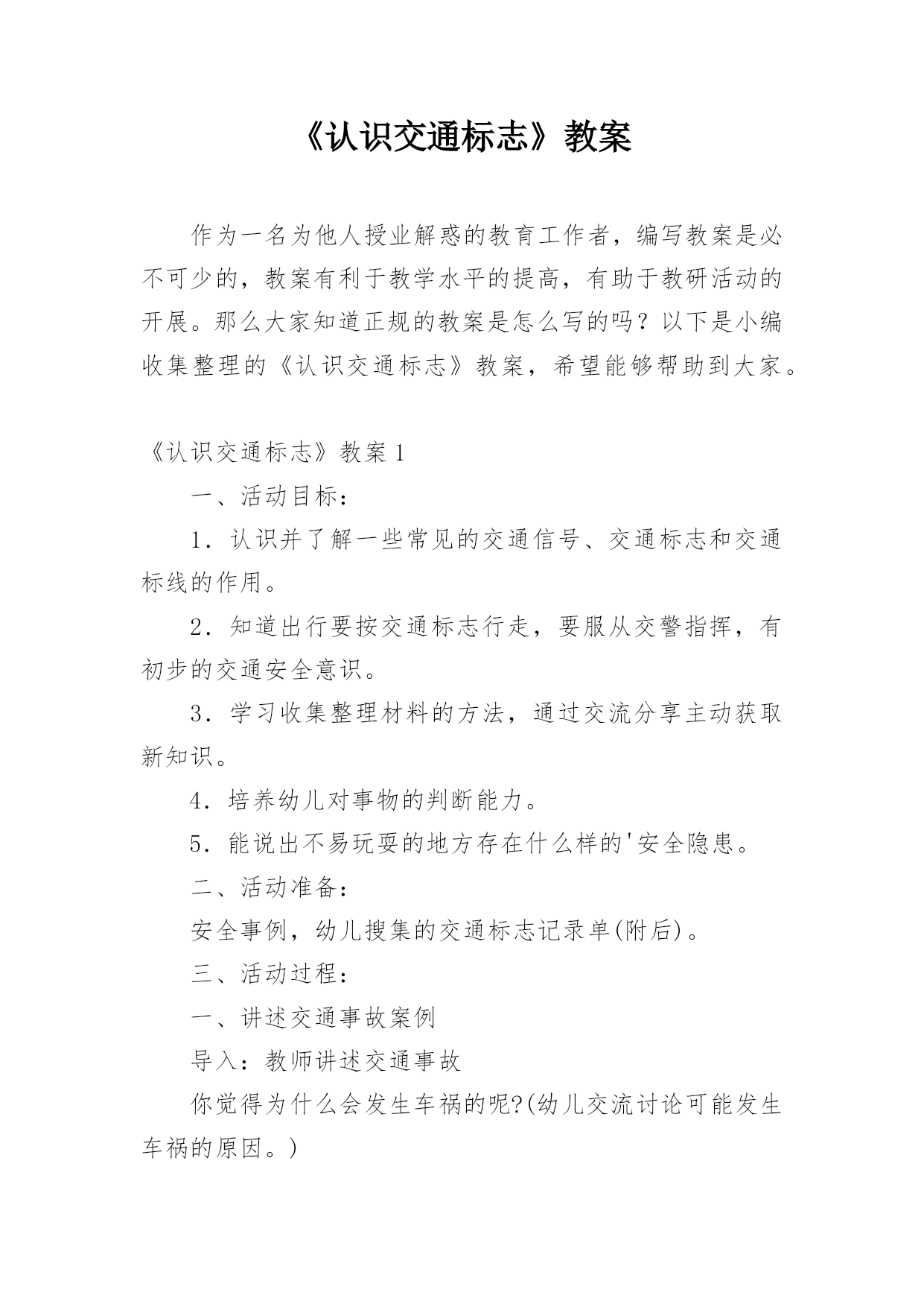 《认识交通标志》教案作为一名为他人授业解惑的教育工作者,编写教案是必不可少的,教案有利于教学水平的提高,有助于教研活动的开展。那么大家知道正规的教案是怎么写的吗?以下是小编收集整理的《认识交通标志》教案,希望能够帮助到大家。《认识交通标志》教案1一、活动目标:1.认识并了解一些常见的交通信号、交通标志和交通标线的作用。2.知道出行要按交通标志行走,要服从交警指挥,有初步的交通安全意识。3.学习收集整理材料的方法,通过交流分享主动获取新知识。4.培养幼儿对事物的判断能力。5.能说出不易玩耍的地方存在什么样的