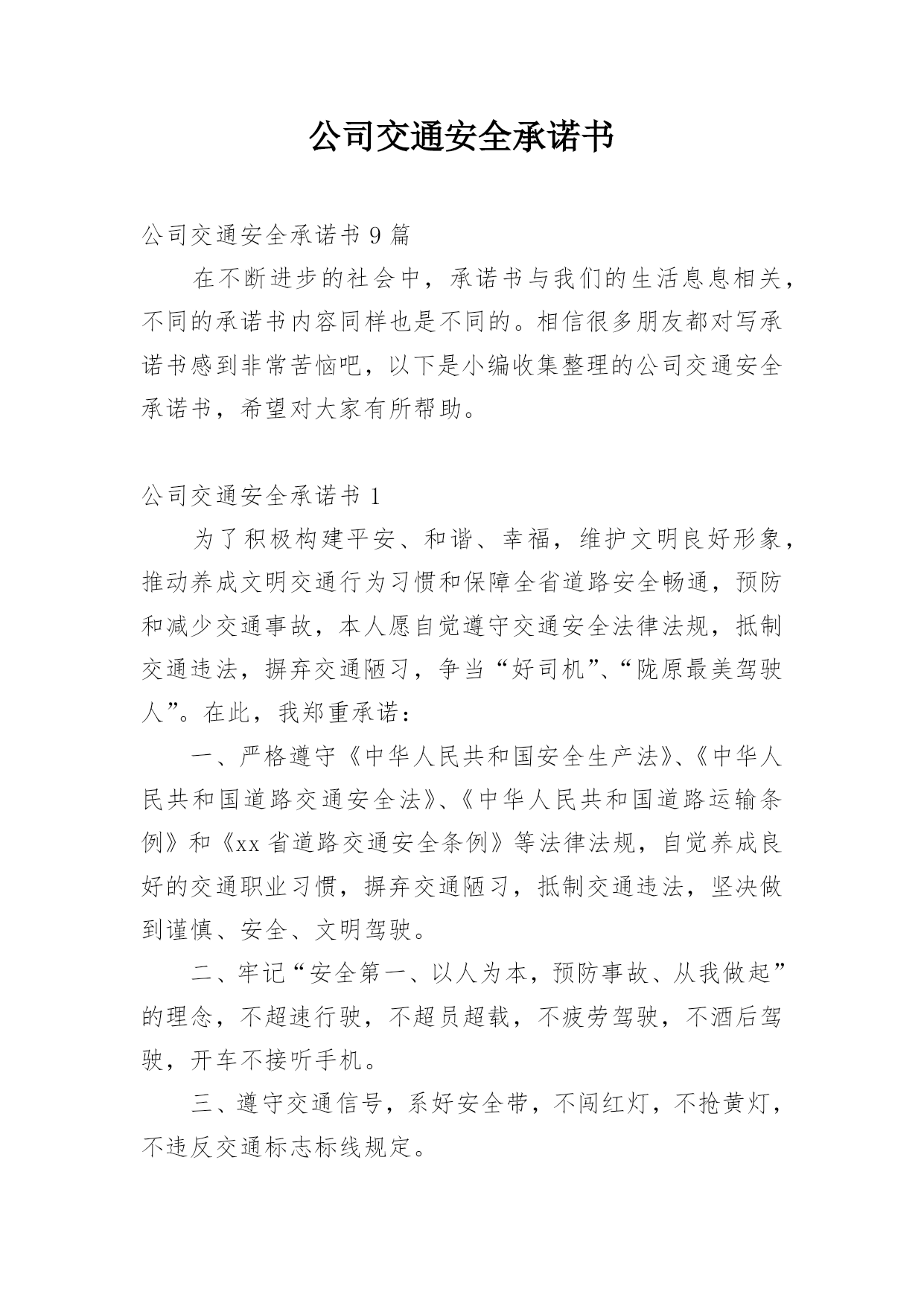公司交通安全承诺书公司交通安全承诺书9篇在不断进步的社会中,承诺书与我们的生活息息相关,不同的承诺书内容同样也是不同的。相信很多朋友都对写承诺书感到非常苦恼吧,以下是小编收集整理的公司交通安全承诺书,希望对大家有所帮助。公司交通安全承诺书1为了积极构建平安、和谐、幸福,维护文明良好形象,推动养成文明交通行为习惯和保障全省道路安全畅通,预防和减少交通事故,本人愿自觉遵守交通安全法律法规,抵制交通违法,摒弃交通陋习,争当“好司机”、“陇原最美驾驶人”。在此,我郑重承诺:一、严格遵守《中华人民共和国安全生产法》