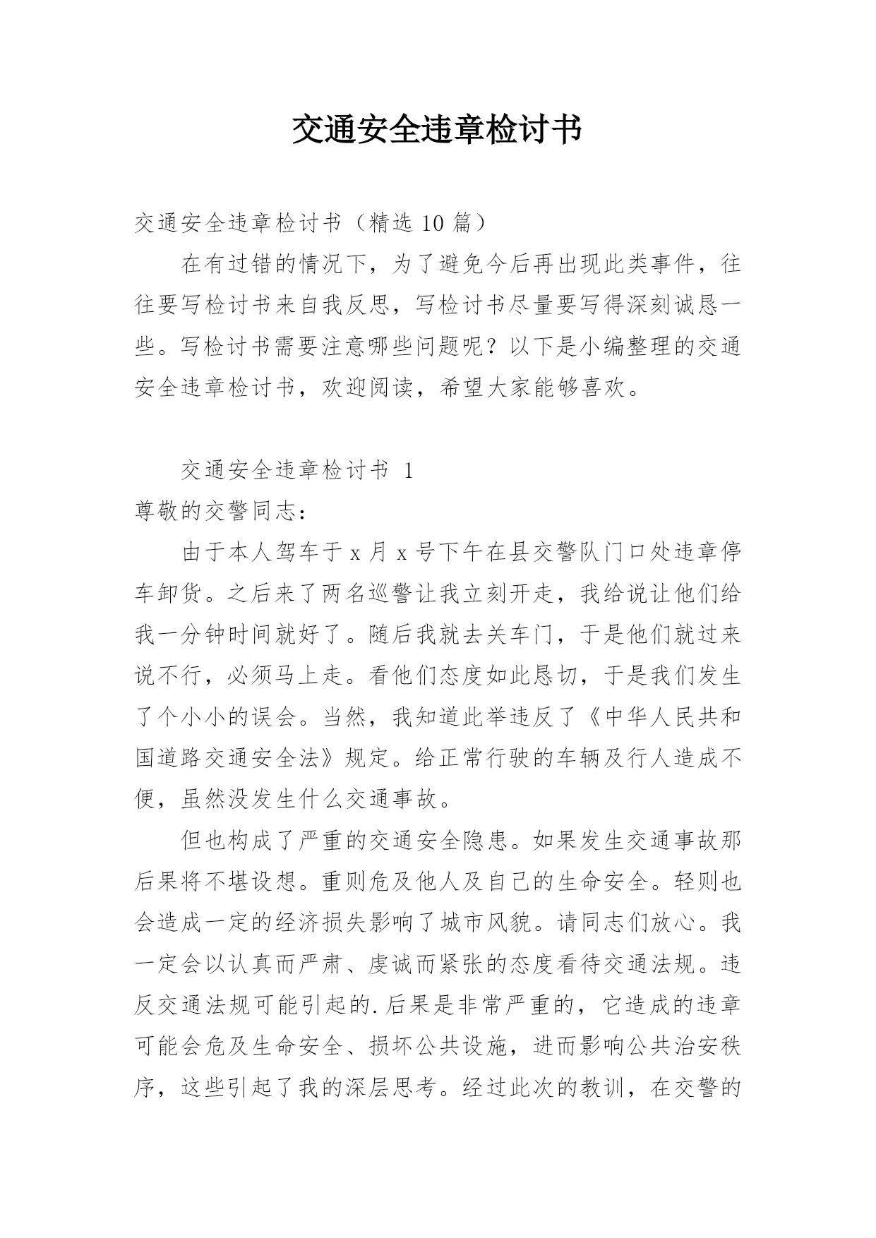 交通安全违章检讨书交通安全违章检讨书(精选10篇)在有过错的情况下,为了避免今后再出现此类事件,往往要写检讨书来自我反思,写检讨书尽量要写得深刻诚恳一些。写检讨书需要注意哪些问题呢?以下是小编整理的交通安全违章检讨书,欢迎阅读,希望大家能够喜欢。交通安全违章检讨书1尊敬的交警同志:由于本人驾车于x月x号下午在县交警队门口处违章停车卸货。之后来了两名巡警让我立刻开走,我给说让他们给我一分钟时间就好了。随后我就去关车门,于是他们就过来说不行,必须马上走。看他们态度如此恳切,于是我们发生了个小小的误会。当然,我