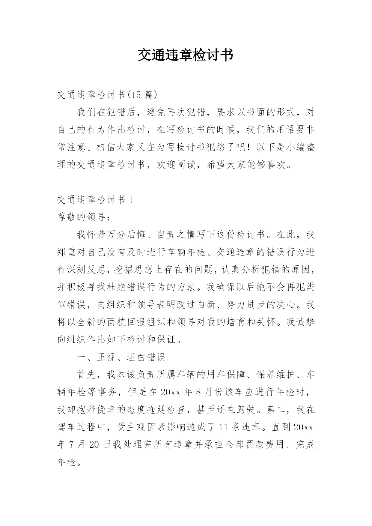 交通违章检讨书交通违章检讨书(15篇)我们在犯错后,避免再次犯错,要求以书面的形式,对自己的行为作出检讨,在写检讨书的时候,我们的用语要非常注意。相信大家又在为写检讨书犯愁了吧!以下是小编整理的交通违章检讨书,欢迎阅读,希望大家能够喜欢。交通违章检讨书1尊敬的领导:我怀着万分后悔、自责之情写下这份检讨书。在此,我郑重对自己没有及时进行车辆年检、交通违章的错误行为进行深刻反思,挖掘思想上存在的问题,认真分析犯错的原因,并积极寻找杜绝错误行为的方法。我确保以后绝不会再犯类似错误,向组织和领导表明改过自新、努力