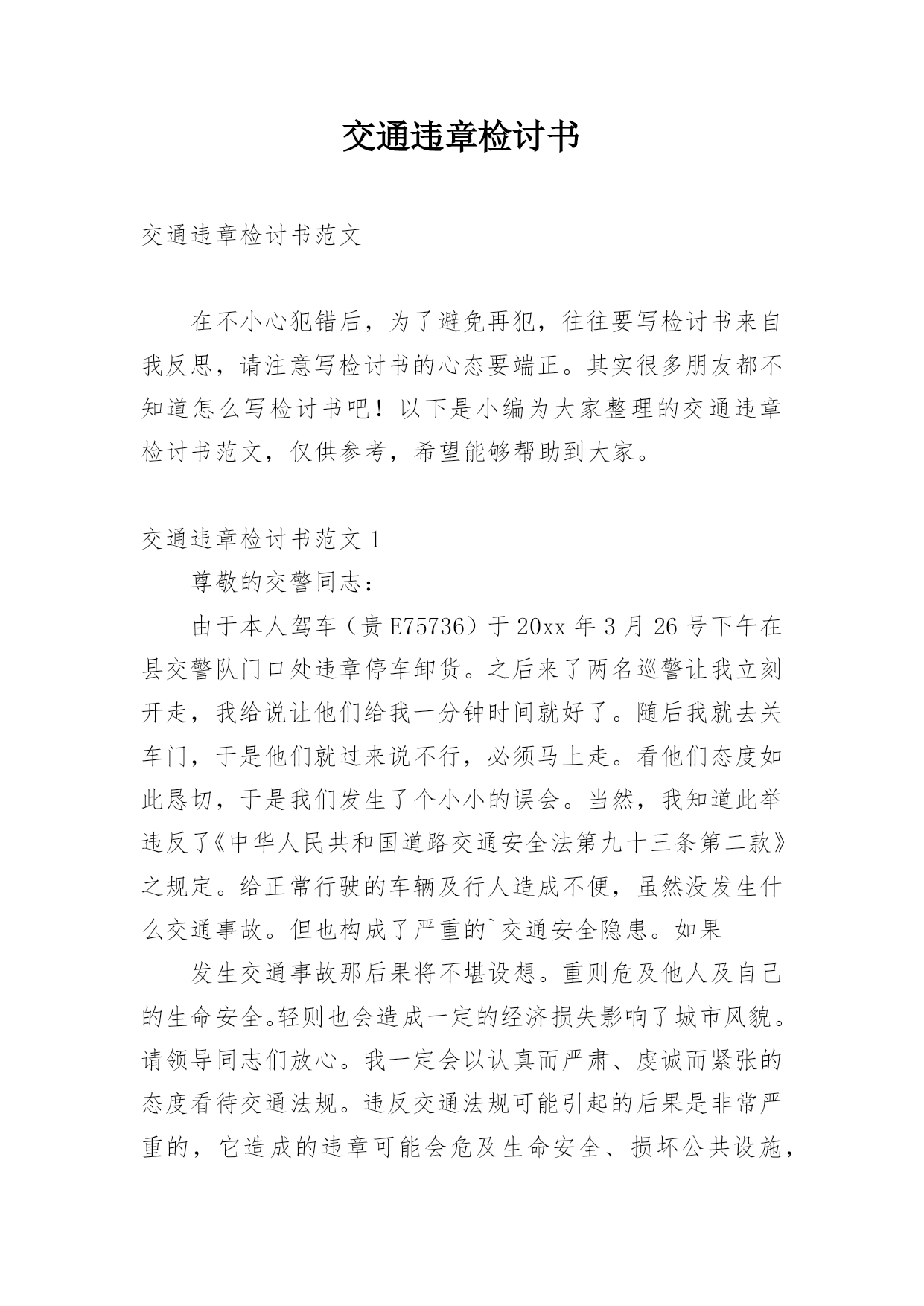 交通违章检讨书交通违章检讨书范文在不小心犯错后,为了避免再犯,往往要写检讨书来自我反思,请注意写检讨书的心态要端正。其实很多朋友都不知道怎么写检讨书吧!以下是小编为大家整理的交通违章检讨书范文,仅供参考,希望能够帮助到大家。交通违章检讨书范文1尊敬的交警同志:由于本人驾车(贵E75736)于20xx年3月26号下午在县交警队门口处违章停车卸货。之后来了两名巡警让我立刻开走,我给说让他们给我一分钟时间就好了。随后我就去关车门,于是他们就过来说不行,必须马上走。看他们态度如此恳切,于是我们发生了个小小的误会。