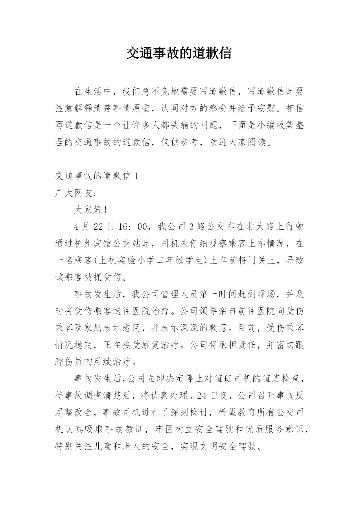 交通事故的道歉信在生活中,我们总不免地需要写道歉信,写道歉信时要注意解释清楚事情原委,认同对方的感受并给予安慰。相信写道歉信是一个让许多人都头痛的问题,下面是小编收集整理的交通事故的道歉信,仅供参考,欢迎大家阅读。交通事故的道歉信1广大网友:大家好!4月22日16:00,我公司3路公交车在北大路上行驶通过杭州宾馆公交站时,司机未仔细观察乘客上车情况,在一名乘客(上杭实验小学二年级学生)上车前将门关上,导致该乘客被抓受伤。事故发生后,我公司管理人员第一时间赶到现场,并及时将受伤乘客送往医院治疗。公司领导亲自