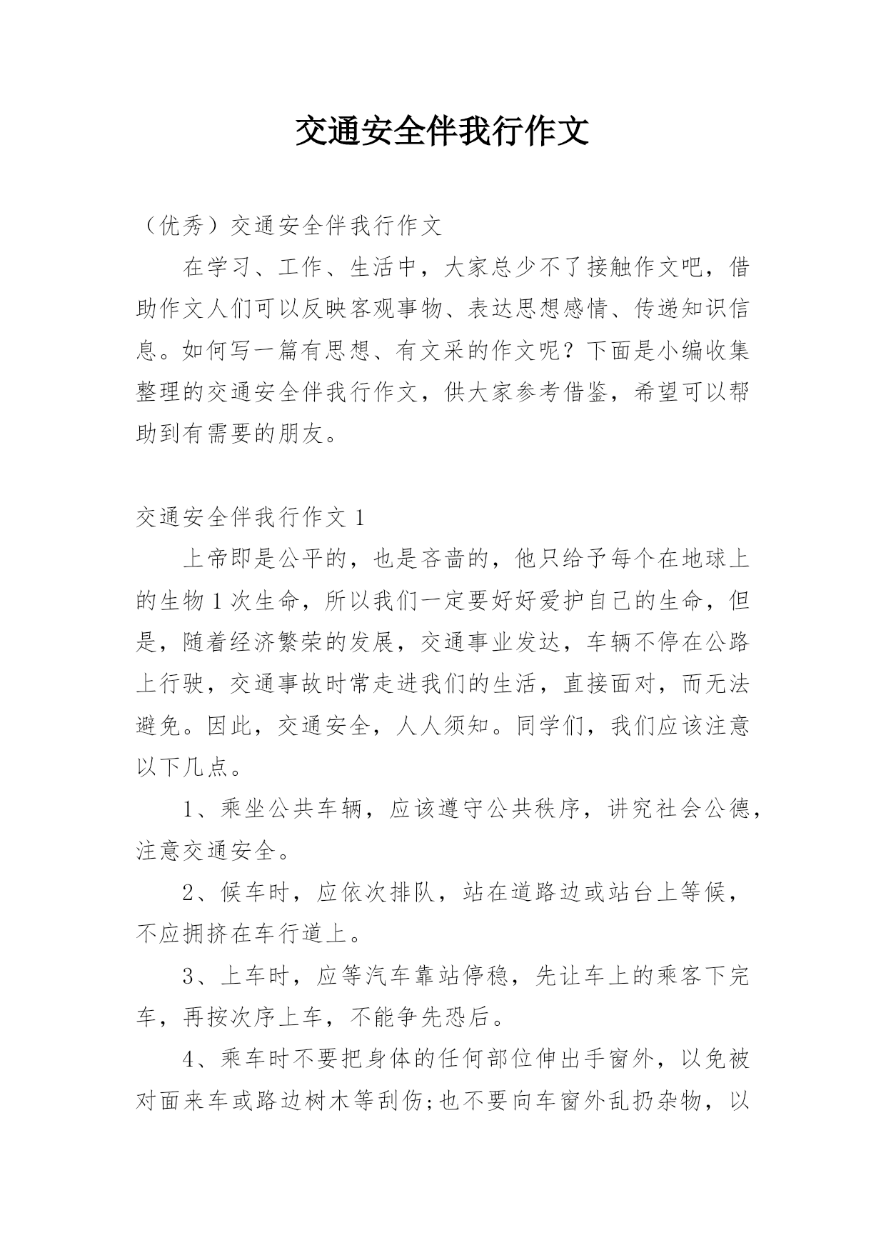 交通安全伴我行作文(优秀)交通安全伴我行作文在学习、工作、生活中,大家总少不了接触作文吧,借助作文人们可以反映客观事物、表达思想感情、传递知识信息。如何写一篇有思想、有文采的作文呢?下面是小编收集整理的交通安全伴我行作文,供大家参考借鉴,希望可以帮助到有需要的朋友。交通安全伴我行作文1上帝即是公平的,也是吝啬的,他只给予每个在地球上的生物1次生命,所以我们一定要好好爱护自己的生命,但是,随着经济繁荣的发展,交通事业发达,车辆不停在公路上行驶,交通事故时常走进我们的生活,直接面对,而无法避免。因此,交通安全