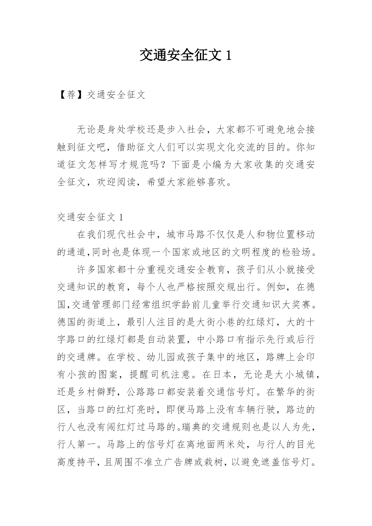 交通安全征文1【荐】交通安全征文无论是身处学校还是步入社会,大家都不可避免地会接触到征文吧,借助征文人们可以实现文化交流的目的。你知道征文怎样写才规范吗?下面是小编为大家收集的交通安全征文,欢迎阅读,希望大家能够喜欢。交通安全征文1在我们现代社会中,城市马路不仅仅是人和物位置移动的通道,同时也是体现一个国家或地区的文明程度的检验场。许多国家都十分重视交通安全教育,孩子们从小就接受交通知识的教育,每个人也严格按照交规出行。例如,在德国,交通管理部门经常组织学龄前儿童举行交通知识大奖赛。德国的街道上,最引人注