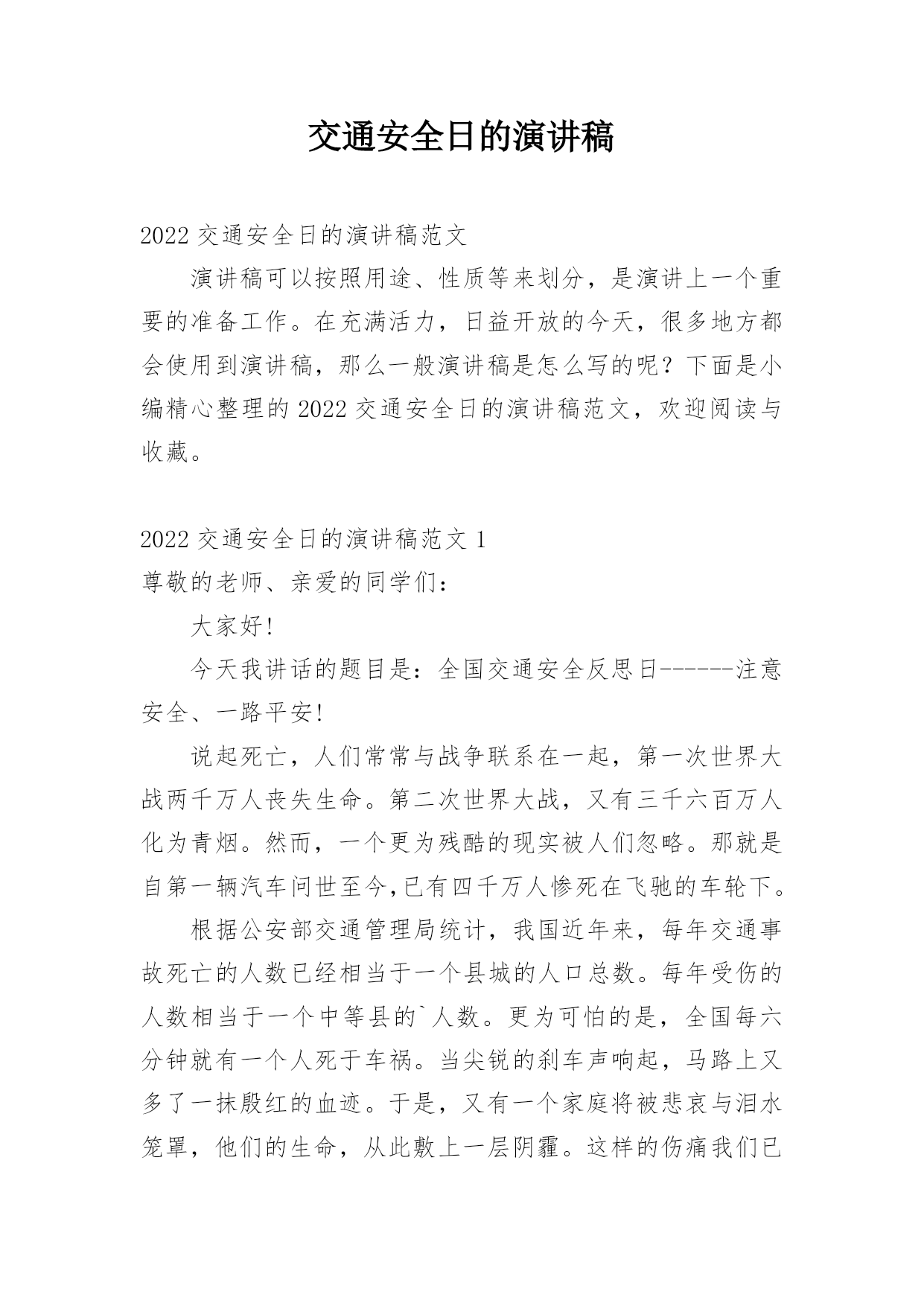 交通安全日的演讲稿2022交通安全日的演讲稿范文演讲稿可以按照用途、性质等来划分,是演讲上一个重要的准备工作。在充满活力,日益开放的今天,很多地方都会使用到演讲稿,那么一般演讲稿是怎么写的呢?下面是小编精心整理的2022交通安全日的演讲稿范文,欢迎阅读与收藏。2022交通安全日的演讲稿范文1尊敬的老师、亲爱的同学们:大家好!今天我讲话的题目是:全国交通安全反思日------注意安全、一路平安!说起死亡,人们常常与战争联系在一起,第一次世界大战两千万人丧失生命。第二次世界大战,又有三千六百万人化为青烟。然而