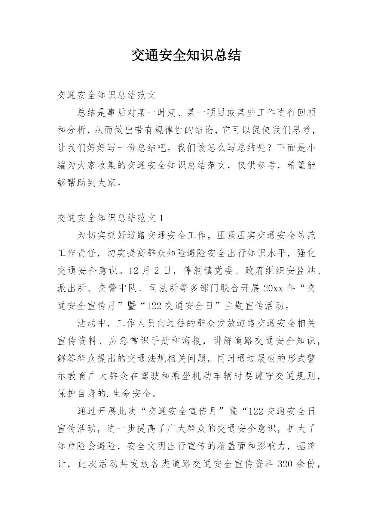 交通安全知识总结交通安全知识总结范文总结是事后对某一时期、某一项目或某些工作进行回顾和分析,从而做出带有规律性的结论,它可以促使我们思考,让我们好好写一份总结吧。我们该怎么写总结呢?下面是小编为大家收集的交通安全知识总结范文,仅供参考,希望能够帮助到大家。交通安全知识总结范文1为切实抓好道路交通安全工作,压紧压实交通安全防范工作责任,切实提高群众知险避险安全出行知识水平,强化交通安全意识。12月2日,停洞镇党委、政府组织安监站、派出所、交警中队、司法所等多部门联合开展20xx年“交通安全宣传月”暨“122