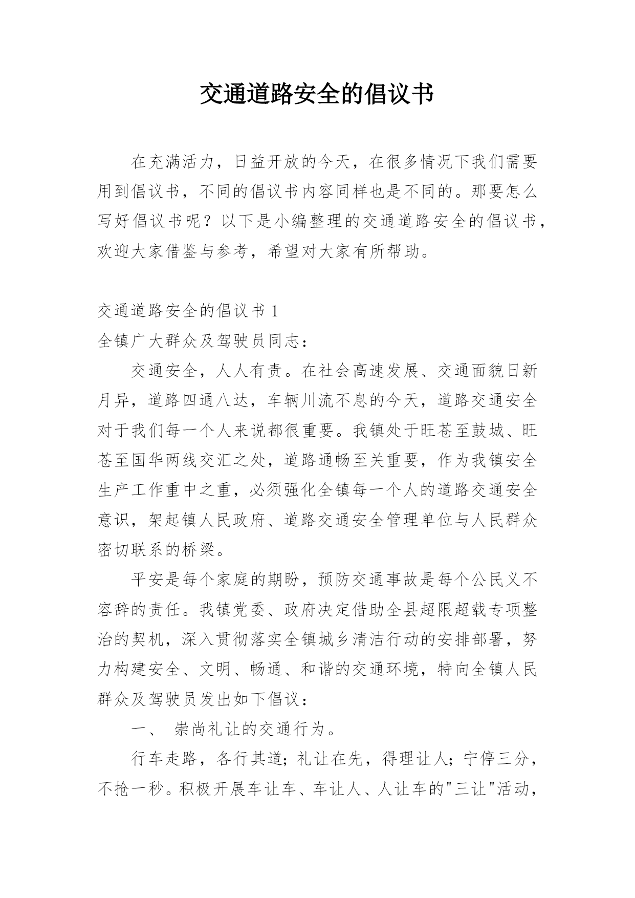 交通道路安全的倡议书在充满活力,日益开放的今天,在很多情况下我们需要用到倡议书,不同的倡议书内容同样也是不同的。那要怎么写好倡议书呢?以下是小编整理的交通道路安全的倡议书,欢迎大家借鉴与参考,希望对大家有所帮助。交通道路安全的倡议书1全镇广大群众及驾驶员同志:交通安全,人人有责。在社会高速发展、交通面貌日新月异,道路四通八达,车辆川流不息的今天,道路交通安全对于我们每一个人来说都很重要。我镇处于旺苍至鼓城、旺苍至国华两线交汇之处,道路通畅至关重要,作为我镇安全生产工作重中之重,必须强化全镇每一个人的道路交