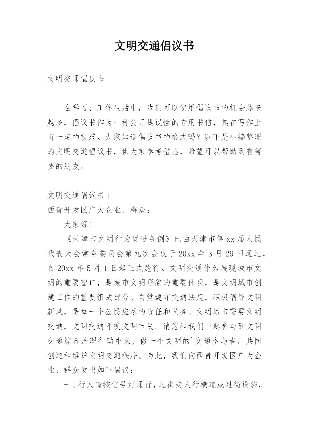 文明交通倡议书文明交通倡议书在学习、工作生活中,我们可以使用倡议书的机会越来越多,倡议书作为一种公开提议性的专用书信,其在写作上有一定的规范。大家知道倡议书的格式吗?以下是小编整理的文明交通倡议书,供大家参考借鉴,希望可以帮助到有需要的朋友。文明交通倡议书1西青开发区广大企业、群众:大家好!《天津市文明行为促进条例》已由天津市第xx届人民代表大会常务委员会第九次会议于20xx年3月29日通过,自20xx年5月1日起正式施行。文明交通作为展现城市文明的重要窗口,是城市文明形象的重要体现,是文明城市创建工作的