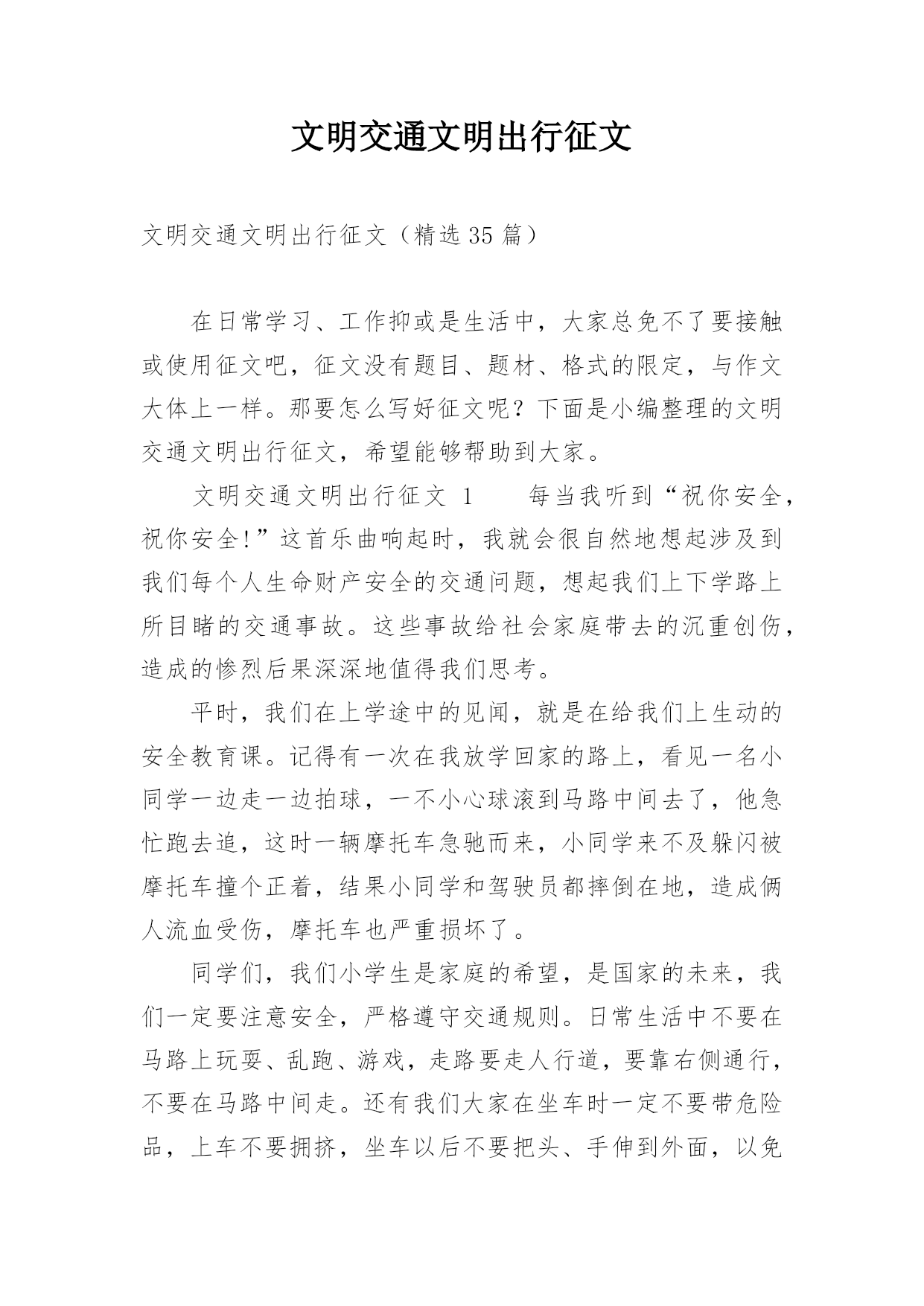 文明交通文明出行征文文明交通文明出行征文(精选35篇)在日常学习、工作抑或是生活中,大家总免不了要接触或使用征文吧,征文没有题目、题材、格式的限定,与作文大体上一样。那要怎么写好征文呢?下面是小编整理的文明交通文明出行征文,希望能够帮助到大家。文明交通文明出行征文1每当我听到“祝你安全,祝你安全!”这首乐曲响起时,我就会很自然地想起涉及到我们每个人生命财产安全的交通问题,想起我们上下学路上所目睹的交通事故。这些事故给社会家庭带去的沉重创伤,造成的惨烈后果深深地值得我们思考。平时,我们在上学途中的见闻,就是