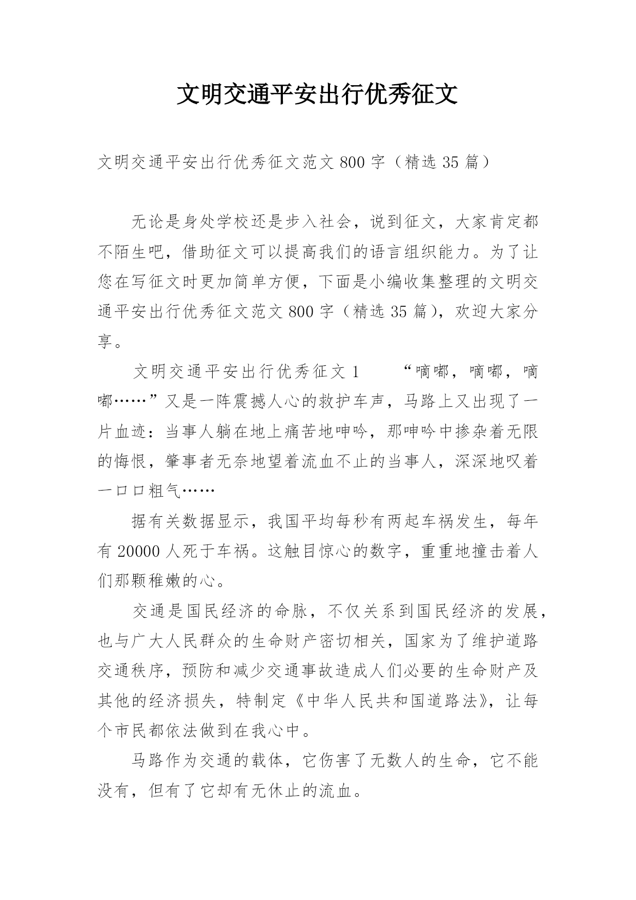 文明交通平安出行优秀征文文明交通平安出行优秀征文范文800字(精选35篇)无论是身处学校还是步入社会,说到征文,大家肯定都不陌生吧,借助征文可以提高我们的语言组织能力。为了让您在写征文时更加简单方便,下面是小编收集整理的文明交通平安出行优秀征文范文800字(精选35篇),欢迎大家分享。文明交通平安出行优秀征文1“嘀嘟,嘀嘟,嘀嘟……”又是一阵震撼人心的救护车声,马路上又出现了一片血迹:当事人躺在地上痛苦地呻吟,那呻吟中掺杂着无限的悔恨,肇事者无奈地望着流血不止的当事人,深深地叹着一口口粗气……据有关数据显