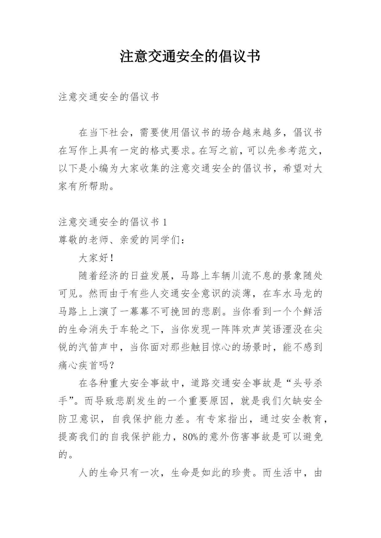 注意交通安全的倡议书注意交通安全的倡议书在当下社会,需要使用倡议书的场合越来越多,倡议书在写作上具有一定的格式要求。在写之前,可以先参考范文,以下是小编为大家收集的注意交通安全的倡议书,希望对大家有所帮助。注意交通安全的倡议书1尊敬的老师、亲爱的同学们:大家好!随着经济的日益发展,马路上车辆川流不息的景象随处可见。然而由于有些人交通安全意识的淡薄,在车水马龙的马路上上演了一幕幕不可挽回的悲剧。当你看到一个个鲜活的生命消失于车轮之下,当你发现一阵阵欢声笑语湮没在尖锐的汽笛声中,当你面对那些触目惊心的场景时,