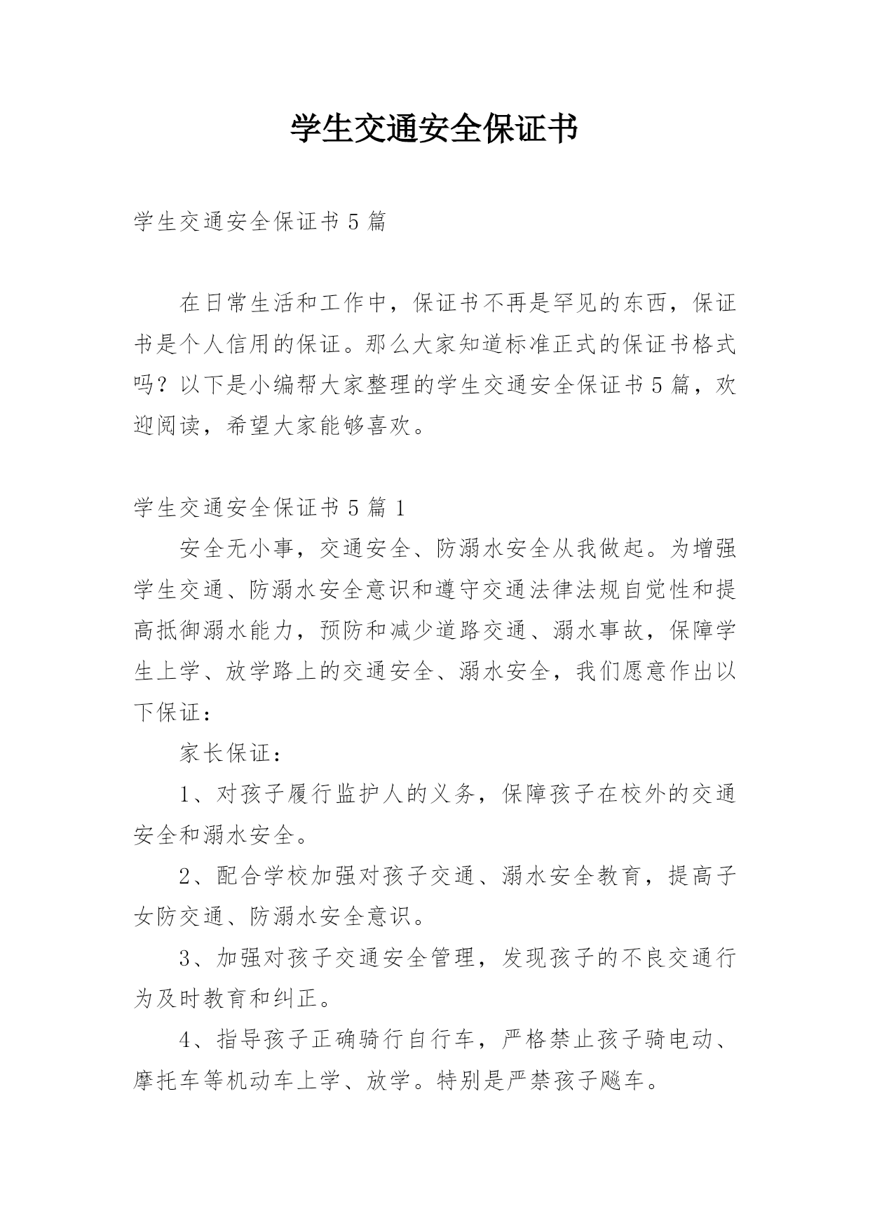 学生交通安全保证书学生交通安全保证书5篇在日常生活和工作中,保证书不再是罕见的东西,保证书是个人信用的保证。那么大家知道标准正式的保证书格式吗?以下是小编帮大家整理的学生交通安全保证书5篇,欢迎阅读,希望大家能够喜欢。学生交通安全保证书5篇1安全无小事,交通安全、防溺水安全从我做起。为增强学生交通、防溺水安全意识和遵守交通法律法规自觉性和提高抵御溺水能力,预防和减少道路交通、溺水事故,保障学生上学、放学路上的交通安全、溺水安全,我们愿意作出以下保证:家长保证:1、对孩子履行监护人的义务,保障孩子在校外的交