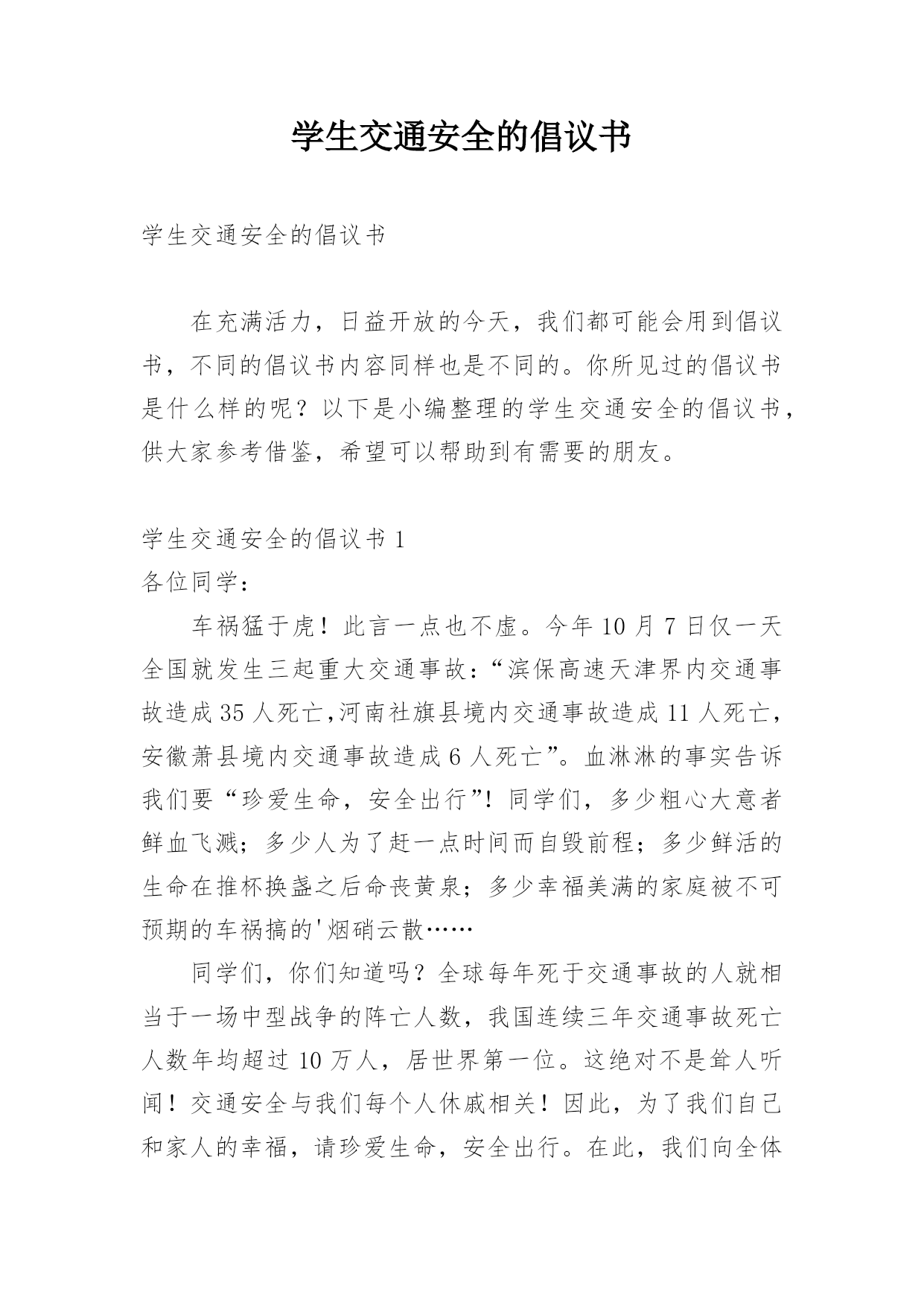 学生交通安全的倡议书学生交通安全的倡议书在充满活力,日益开放的今天,我们都可能会用到倡议书,不同的倡议书内容同样也是不同的。你所见过的倡议书是什么样的呢?以下是小编整理的学生交通安全的倡议书,供大家参考借鉴,希望可以帮助到有需要的朋友。学生交通安全的倡议书1各位同学:车祸猛于虎!此言一点也不虚。今年10月7日仅一天全国就发生三起重大交通事故:“滨保高速天津界内交通事故造成35人死亡,河南社旗县境内交通事故造成11人死亡,安徽萧县境内交通事故造成6人死亡”。血淋淋的事实告诉我们要“珍爱生命,安全出行”!同学