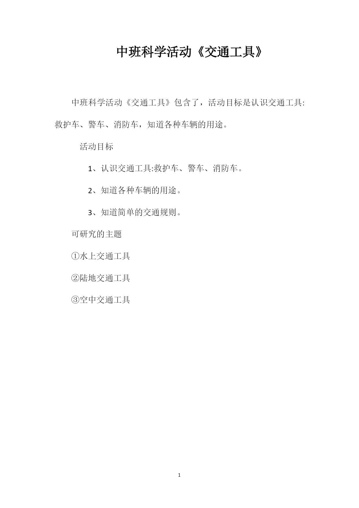 PAGEPAGE1中班科学活动《交通工具》中班科学活动《交通工具》包含了,活动目标是认识交通工具:救护车、警车、消防车,知道各种车辆的用途。活动目标1、认识交通工具:救护车、警车、消防车。2、知道各种车辆的用途。3、知道简单的交通规则。可研究的主题①水上交通工具②陆地交通工具③空中交通工具