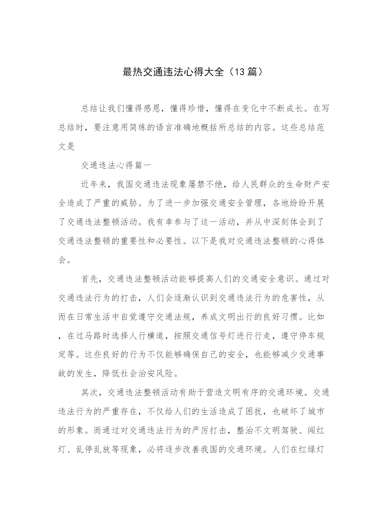 最热交通违法心得大全(13篇)总结让我们懂得感恩,懂得珍惜,懂得在变化中不断成长。在写总结时,要注意用简练的语言准确地概括所总结的内容。这些总结范文是交通违法心得篇一近年来,我国交通违法现象屡禁不绝,给人民群众的生命财产安全造成了严重的威胁。为了进一步加强交通安全管理,各地纷纷开展了交通违法整顿活动。我有幸参与了这一活动,并从中深刻体会到了交通违法整顿的重要性和必要性。以下是我对交通违法整顿的心得体会。首先,交通违法整顿活动能够提高人们的交通安全意识。通过对交通违法行为的打击,人们会逐渐认识到交通违法行为