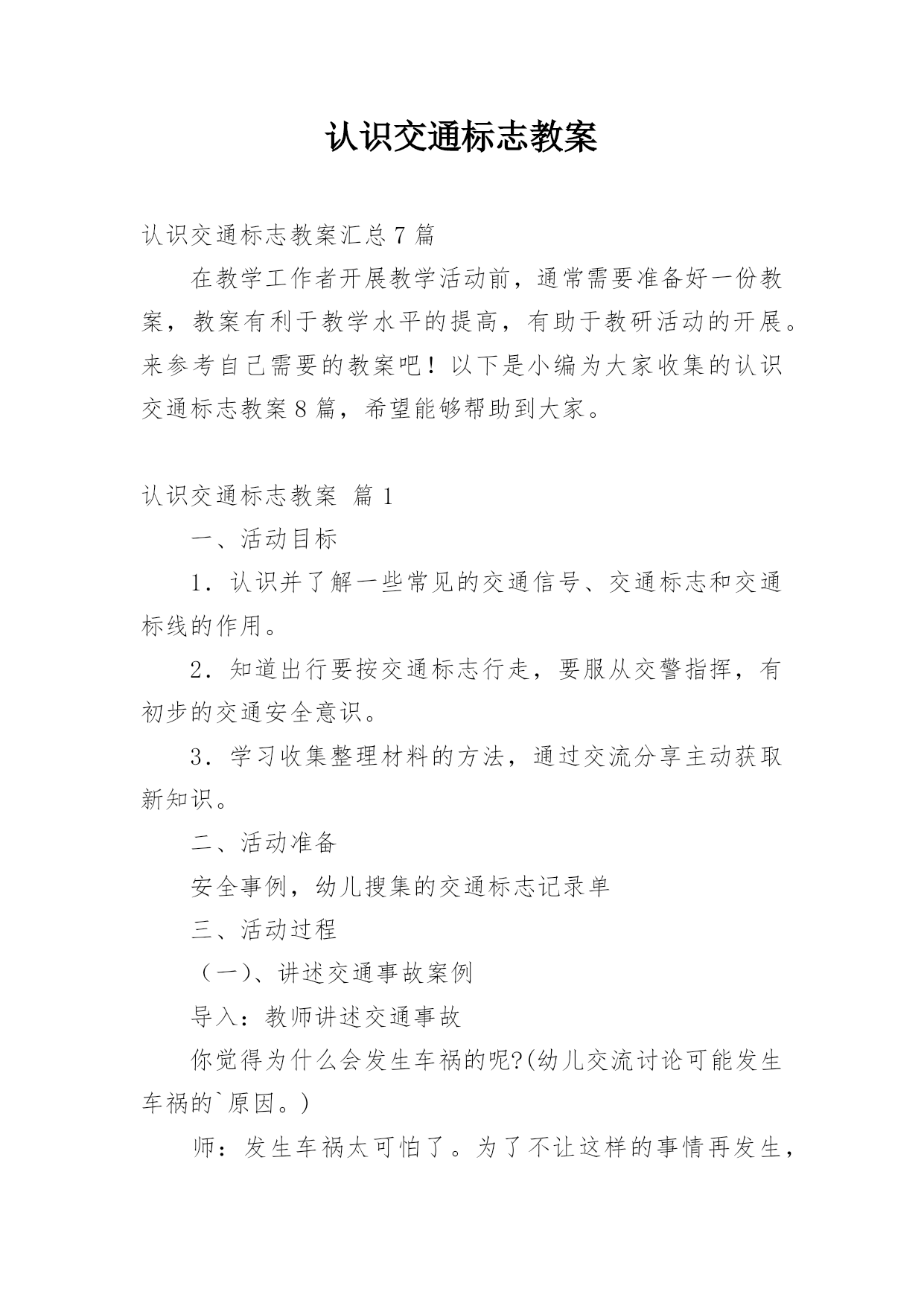 认识交通标志教案认识交通标志教案汇总7篇在教学工作者开展教学活动前,通常需要准备好一份教案,教案有利于教学水平的提高,有助于教研活动的开展。来参考自己需要的教案吧!以下是小编为大家收集的认识交通标志教案8篇,希望能够帮助到大家。认识交通标志教案篇1一、活动目标1.认识并了解一些常见的交通信号、交通标志和交通标线的作用。2.知道出行要按交通标志行走,要服从交警指挥,有初步的交通安全意识。3.学习收集整理材料的方法,通过交流分享主动获取新知识。二、活动准备安全事例,幼儿搜集的交通标志记录单三、活动过程(一)、