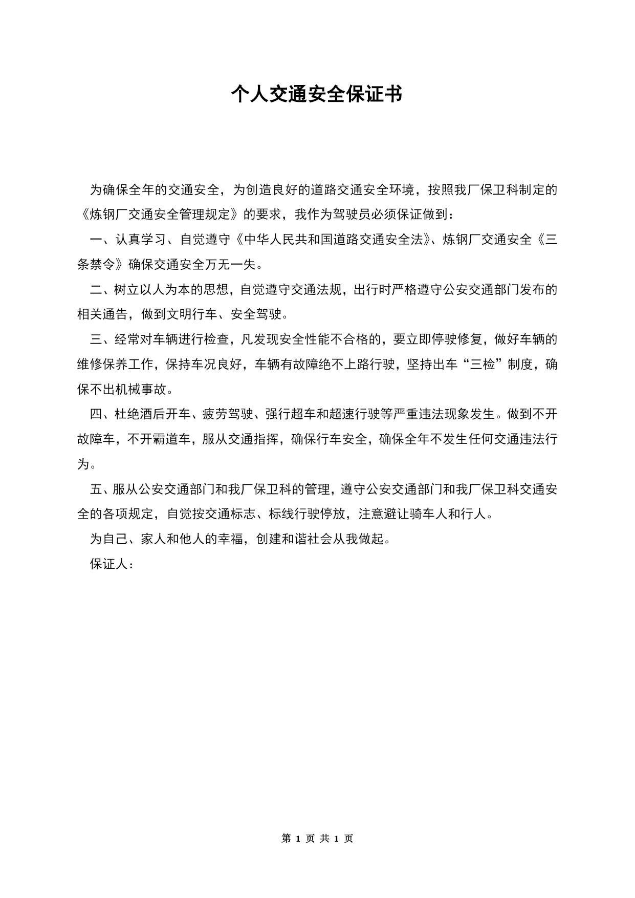 第PAGE\*MERGEFORMAT1页共NUMPAGES\*MERGEFORMAT1页个人交通安全保证书为确保全年的交通安全,为创造良好的道路交通安全环境,按照我厂保卫科制定的《炼钢厂交通安全管理规定》的要求,我作为驾驶员必须保证做到:一、认真学习、自觉遵守《中华人民共和国道路交通安全法》、炼钢厂交通安全《三条禁令》确保交通安全万无一失。二、树立以人为本的思想,自觉遵守交通法规,出行时严格遵守公安交通部门发布的相关通告,做到文明行车、安全驾驶。三、经常对车辆进行检查,凡发现安全性能不合格的,