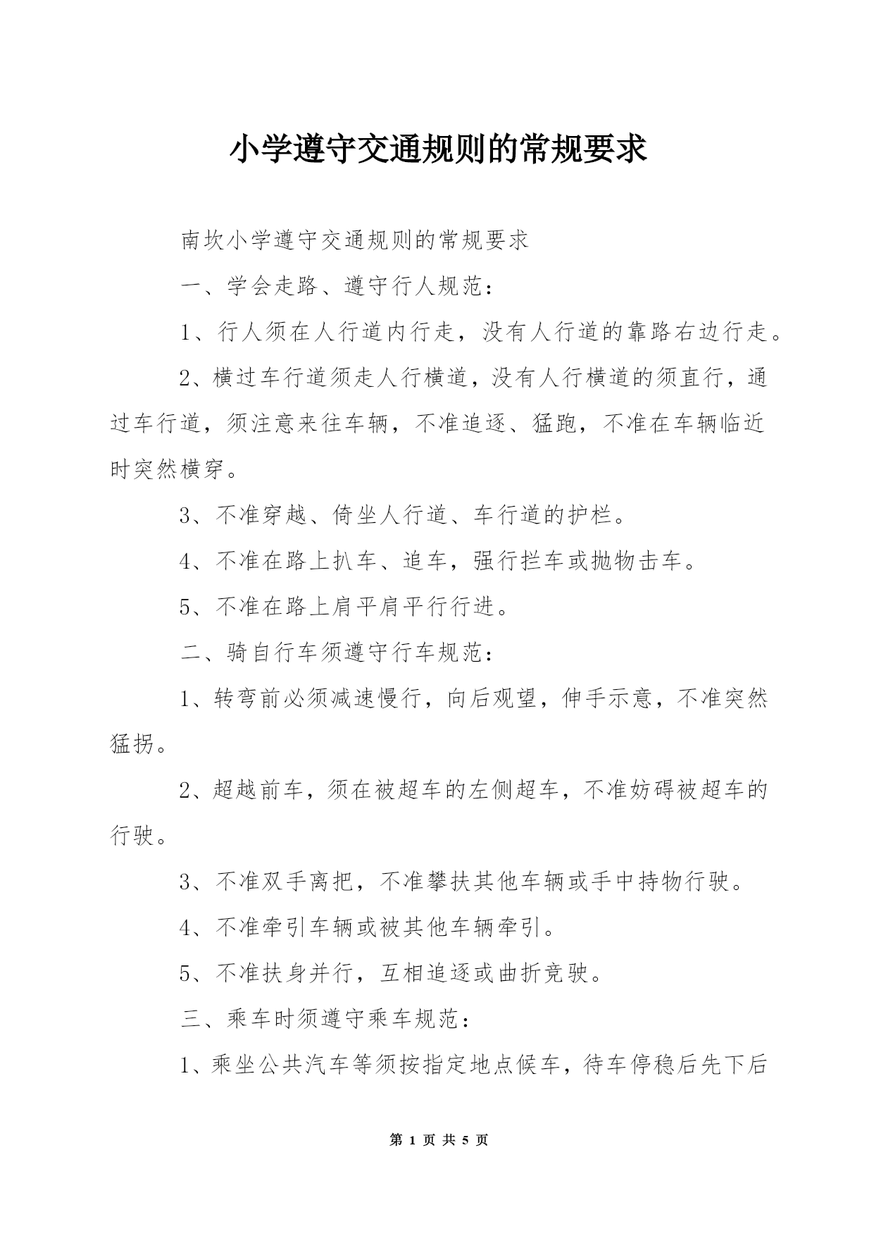 第PAGE\*MERGEFORMAT5页共NUMPAGES\*MERGEFORMAT5页小学遵守交通规则的常规要求南坎小学遵守交通规则的常规要求一、学会走路、遵守行人规范:1、行人须在人行道内行走,没有人行道的靠路右边行走。2、横过车行道须走人行横道,没有人行横道的须直行,通过车行道,须注意来往车辆,不准追逐、猛跑,不准在车辆临近时突然横穿。3、不准穿越、倚坐人行道、车行道的护栏。4、不准在路上扒车、追车,强行拦车或抛物击车。5、不准在路上肩平肩平行行进。二、骑自行车须遵守行车规范:1、转弯前