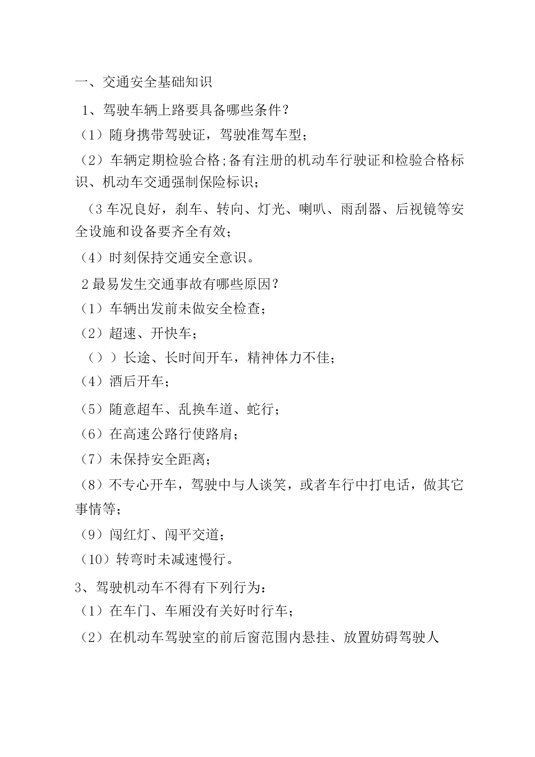 一、交通安全基础知识1、驾驶车辆上路要具备哪些条件?(1)随身携带驾驶证,驾驶准驾车型;(2)车辆定期检验合格;备有注册的机动车行驶证和检验合格标识、机动车交通强制保险标识;(3车况良好,刹车、转向、灯光、喇叭、雨刮器、后视镜等安全设施和设备要齐全有效;(4)时刻保持交通安全意识。2最易发生交通事故有哪些原因?(1)车辆出发前未做安全检查;(2)超速、开快车;())长途、长时间开车,精神体力不佳;(4)酒后开车;(5)随意超车、乱换车道、蛇行;(6)在高速公路行使路肩;(7)未保持安全距离;(8)不专心开