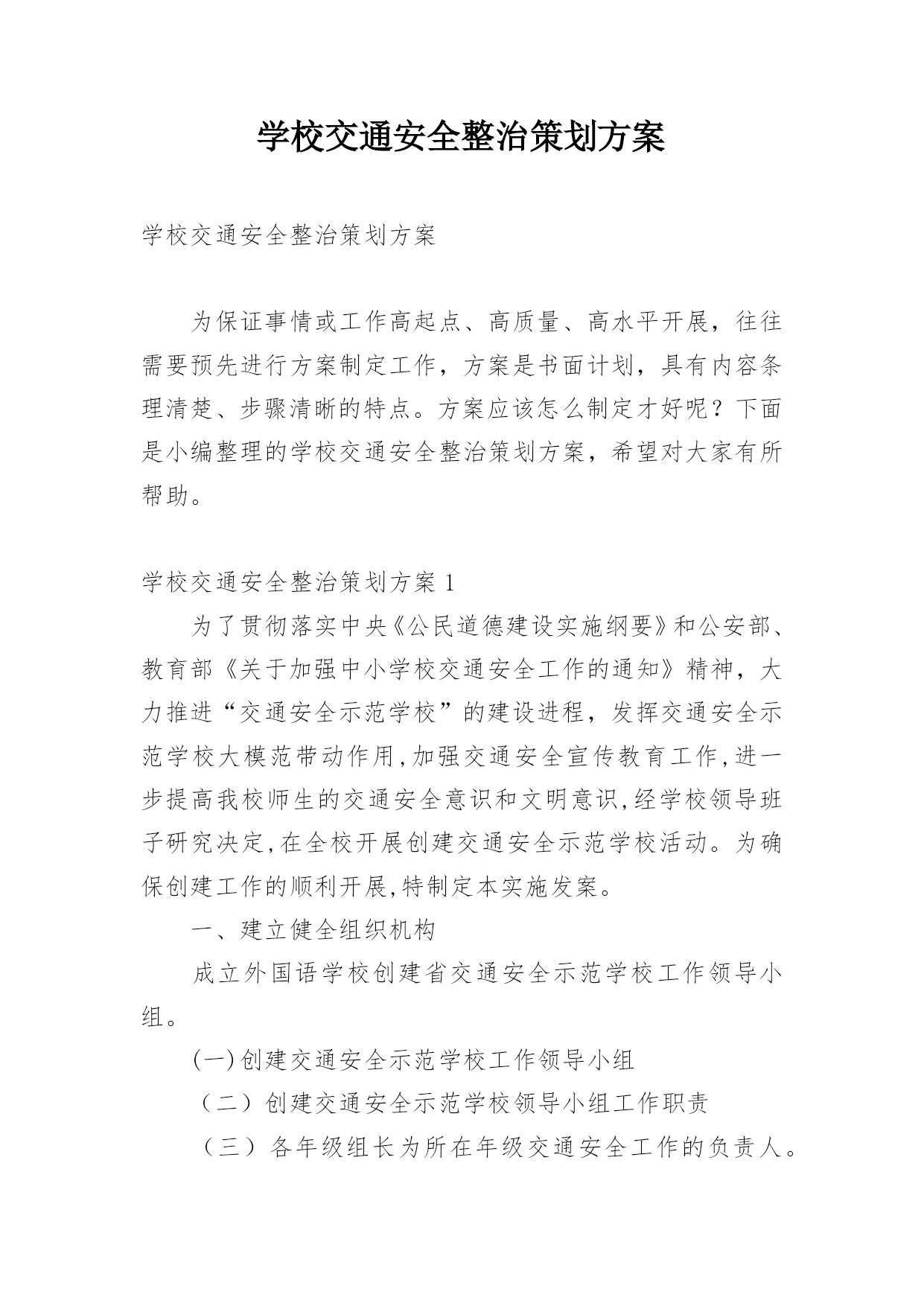 学校交通安全整治策划方案学校交通安全整治策划方案为保证事情或工作高起点、高质量、高水平开展,往往需要预先进行方案制定工作,方案是书面计划,具有内容条理清楚、步骤清晰的特点。方案应该怎么制定才好呢?下面是小编整理的学校交通安全整治策划方案,希望对大家有所帮助。学校交通安全整治策划方案1为了贯彻落实中央《公民道德建设实施纲要》和公安部、教育部《关于加强中小学校交通安全工作的通知》精神,大力推进“交通安全示范学校”的建设进程,发挥交通安全示范学校大模范带动作用,加强交通安全宣传教育工作,进一步提高我校师生的交通