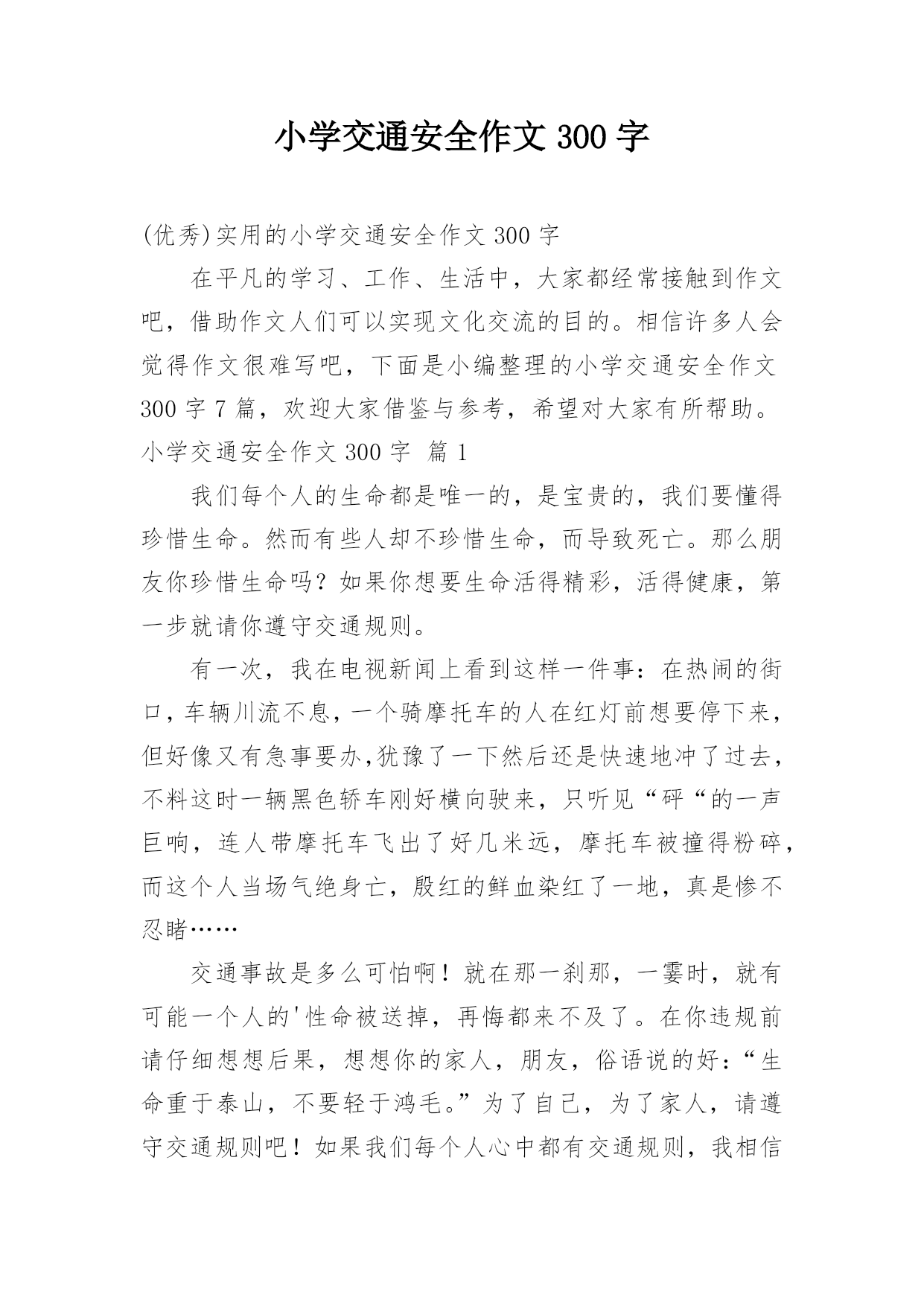 小学交通安全作文300字(优秀)实用的小学交通安全作文300字在平凡的学习、工作、生活中,大家都经常接触到作文吧,借助作文人们可以实现文化交流的目的。相信许多人会觉得作文很难写吧,下面是小编整理的小学交通安全作文300字7篇,欢迎大家借鉴与参考,希望对大家有所帮助。小学交通安全作文300字篇1我们每个人的生命都是唯一的,是宝贵的,我们要懂得珍惜生命。然而有些人却不珍惜生命,而导致死亡。那么朋友你珍惜生命吗?如果你想要生命活得精彩,活得健康,第一步就请你遵守交通规则。有一次,我在电视新闻上看到这样一件事:在