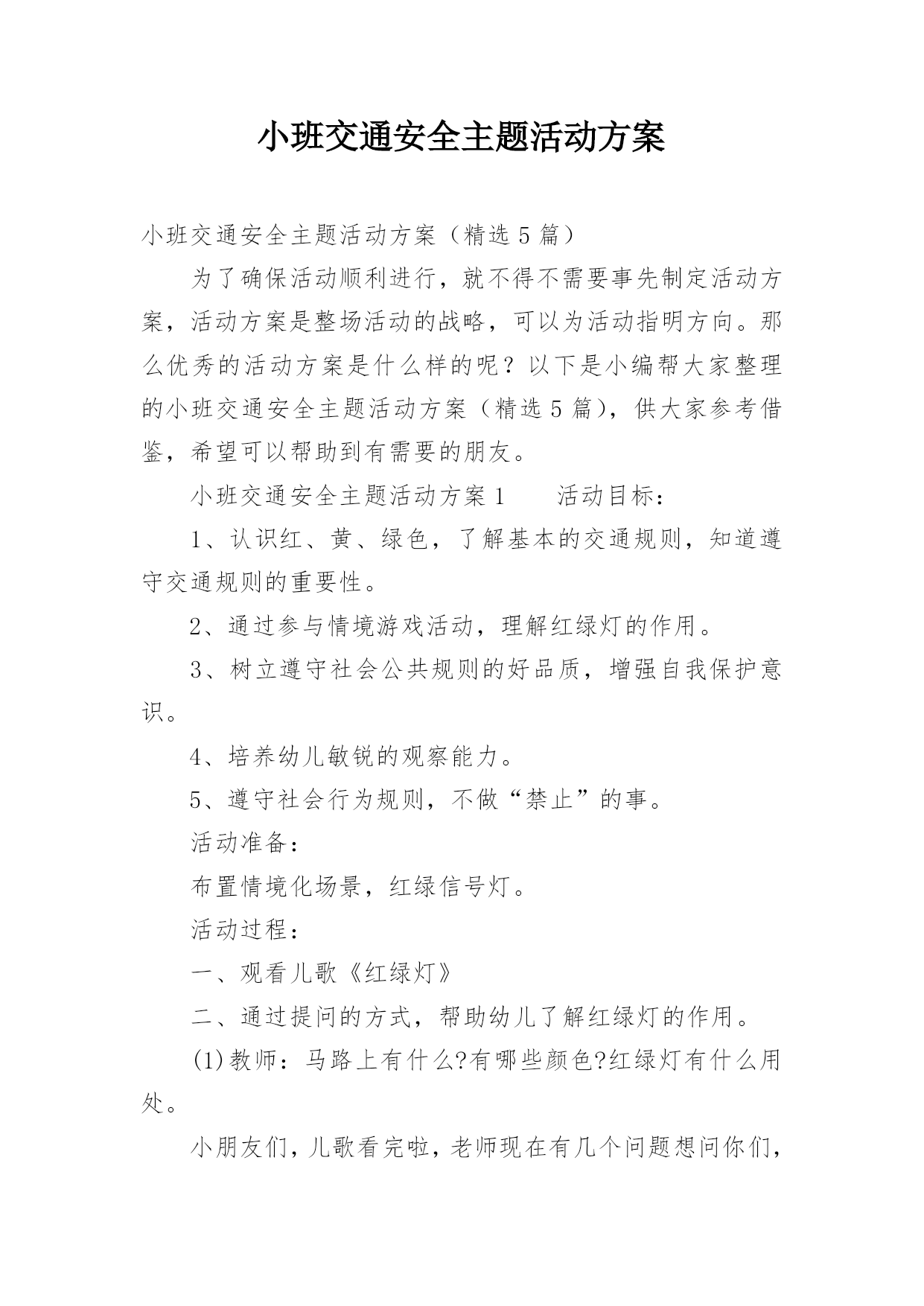 小班交通安全主题活动方案小班交通安全主题活动方案(精选5篇)为了确保活动顺利进行,就不得不需要事先制定活动方案,活动方案是整场活动的战略,可以为活动指明方向。那么优秀的活动方案是什么样的呢?以下是小编帮大家整理的小班交通安全主题活动方案(精选5篇),供大家参考借鉴,希望可以帮助到有需要的朋友。小班交通安全主题活动方案1活动目标:1、认识红、黄、绿色,了解基本的交通规则,知道遵守交通规则的重要性。2、通过参与情境游戏活动,理解红绿灯的作用。3、树立遵守社会公共规则的好品质,增强自我保护意识。4、培养幼儿敏锐