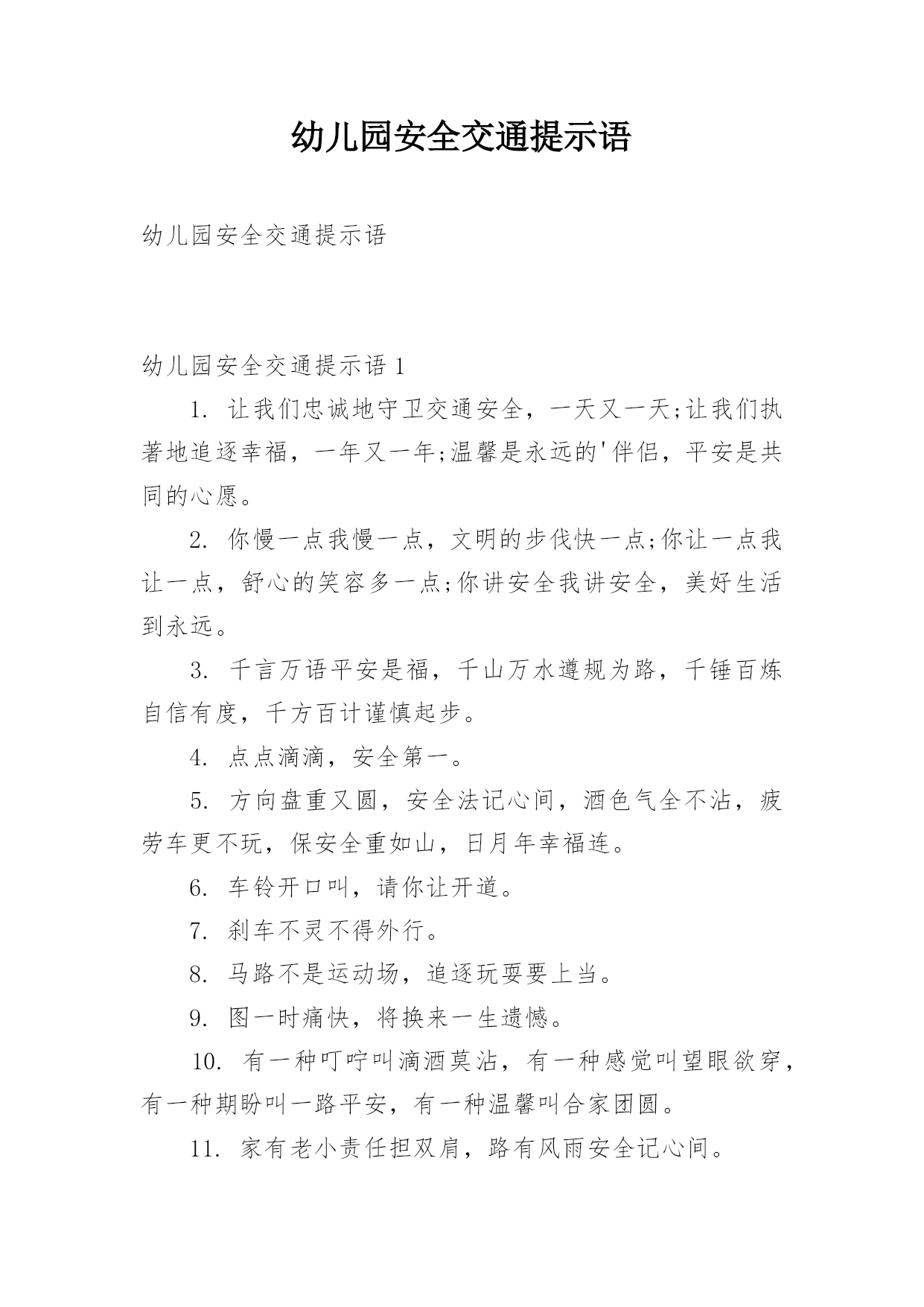 幼儿园安全交通提示语幼儿园安全交通提示语幼儿园安全交通提示语11.让我们忠诚地守卫交通安全,一天又一天;让我们执著地追逐幸福,一年又一年;温馨是永远的'伴侣,平安是共同的心愿。2.你慢一点我慢一点,文明的步伐快一点;你让一点我让一点,舒心的笑容多一点;你讲安全我讲安全,美好生活到永远。3.千言万语平安是福,千山万水遵规为路,千锤百炼自信有度,千方百计谨慎起步。4.点点滴滴,安全第一。5.方向盘重又圆,安全法记心间,酒色气全不沾,疲劳车更不玩,保安全重如山,日月年幸福连。6.车铃开口叫,请你让开道。7.刹车
